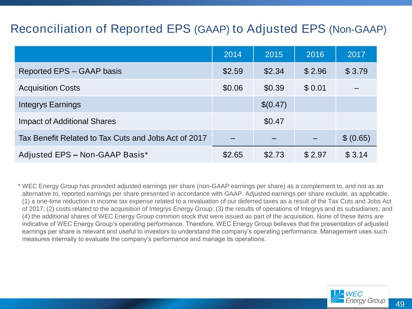 49 Reconciliation of Reported EPS (GAAP) to Adjusted EPS (Non-GAAP) 2014 2015 2016 2017 Reported EPS – GAAP basis $2.59 $2.34 $ 2.96 $ 3.79 Acquisition Costs $0.06 $0.39 $ 0.01 – Integrys Earnings $(0.47) Impact of Additional Shares $0.47 Tax Benefit Related to Tax Cuts and Jobs Act of 2017 – – – $ (0.65) Adjusted EPS – Non-GAAP Basis* $2.65 $2.73 $ 2.97 $ 3.14 * WEC Energy Group has provided adjusted earnings per share (non-GAAP earnings per share) as a complement to, and not as an alternative to, reported earnings per share presented in accordance with GAAP. Adjusted earnings per share exclude, as applicable, (1) a one-time reduction in income tax expense related to a revaluation of our deferred taxes as a result of the Tax Cuts and Jobs Act of 2017; (2) costs related to the acquisition of Integrys Energy Group; (3) the results of operations of Integrys and its subsidiaries; and (4) the additional shares of WEC Energy Group common stock that were issued as part of the acquisition. None of these items are indicative of WEC Energy Group’s operating performance. Therefore, WEC Energy Group believes that the presentation of adjusted earnings per share is relevant and useful to investors to understand the company’s operating performance. Management uses such measures internally to evaluate the company’s performance and manage its operations.