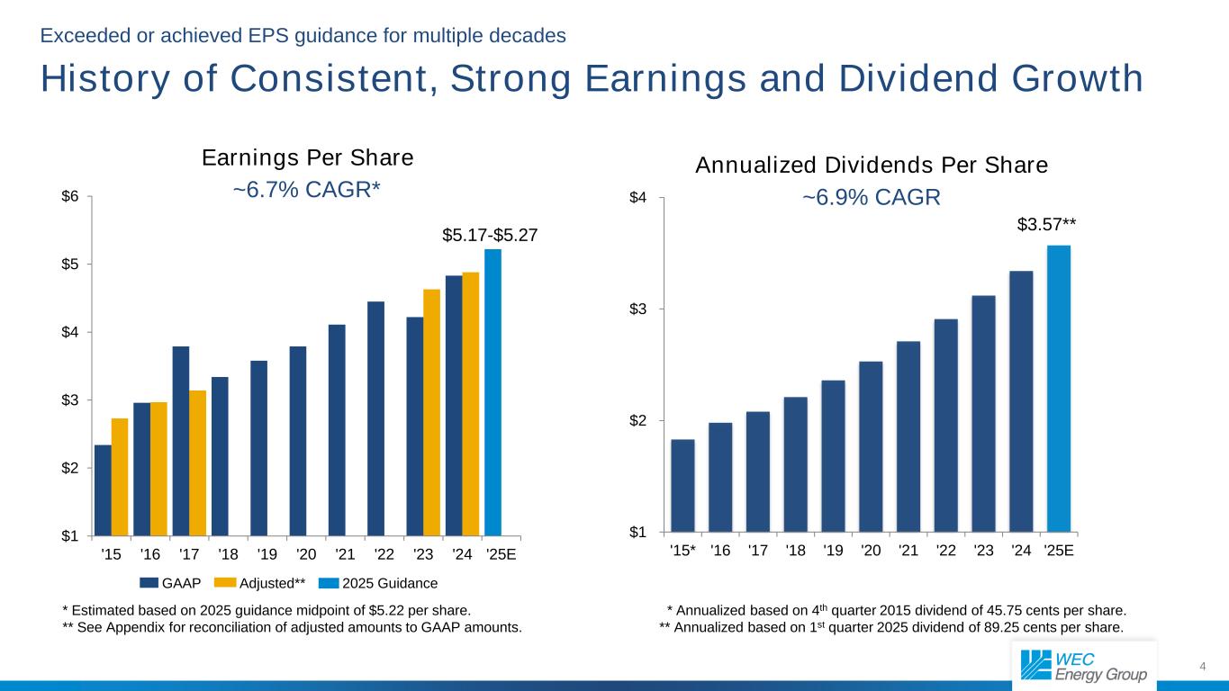 3 The Premier Energy Company in America’s Heartland * As of May. 30, 2025 $34.3 billion market cap* 4.7 million retail customers 60% ownership of American Transmission Company $48.2 billion of assets Ranked first overall in the 2024 E Source Large Business Customer Satisfaction Study