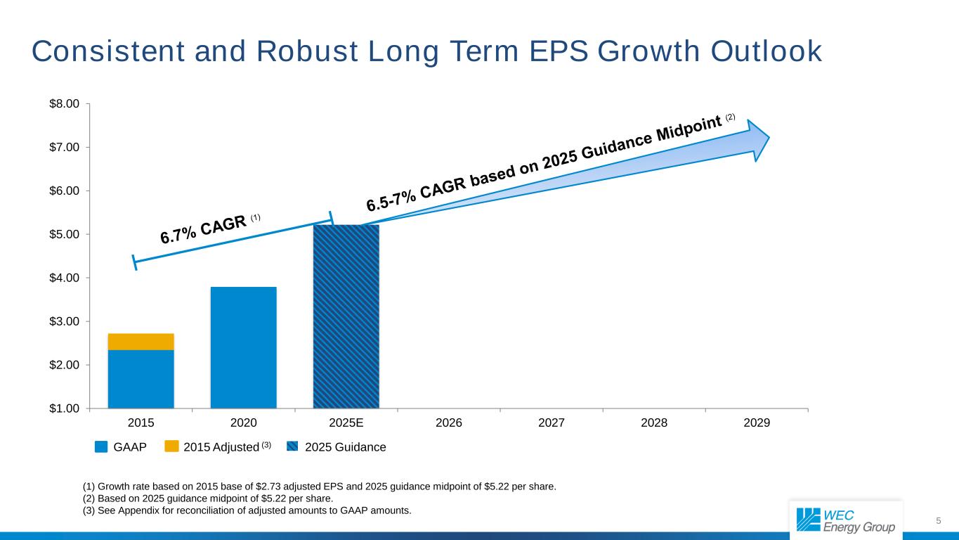 4 $1 $2 $3 $4 $5 $6 '15 '16 '17 '18 '19 '20 '21 '22 '23 '24 '25E * Estimated based on 2025 guidance midpoint of $5.22 per share. ** See Appendix for reconciliation of adjusted amounts to GAAP amounts. $5.17-$5.27 $3.57** $1 $2 $3 $4 '15* '16 '17 '18 '19 '20 '21 '22 '23 '24 '25E * Annualized based on 4th quarter 2015 dividend of 45.75 cents per share. ** Annualized based on 1st quarter 2025 dividend of 89.25 cents per share. Exceeded or achieved EPS guidance for multiple decades History of Consistent, Strong Earnings and Dividend Growth ~6.7% CAGR* Annualized Dividends Per Share ~6.9% CAGR Earnings Per Share GAAP Adjusted** 2025 Guidance