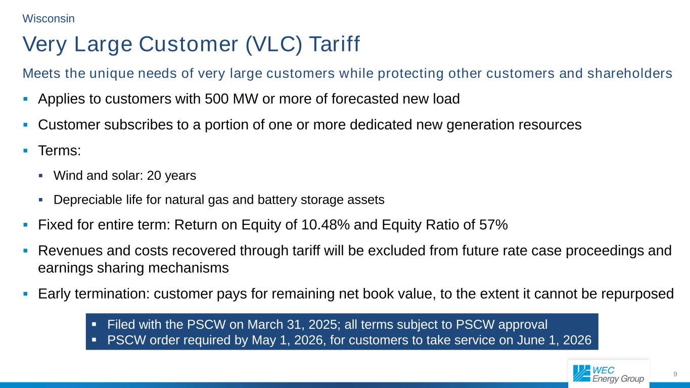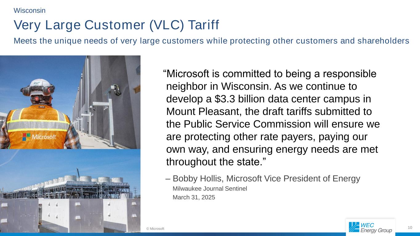 9 Wisconsin Very Large Customer (VLC) Tariff Meets the unique needs of very large customers while protecting other customers and shareholders  Applies to customers with 500 MW or more of forecasted new load  Customer subscribes to a portion of one or more dedicated new generation resources  Terms:  Wind and solar: 20 years  Depreciable life for natural gas and battery storage assets  Fixed for entire term: Return on Equity of 10.48% and Equity Ratio of 57%  Revenues and costs recovered through tariff will be excluded from future rate case proceedings and earnings sharing mechanisms  Early termination: customer pays for remaining net book value, to the extent it cannot be repurposed  Filed with the PSCW on March 31, 2025; all terms subject to PSCW approval  PSCW order required by May 1, 2026, for customers to take service on June 1, 2026