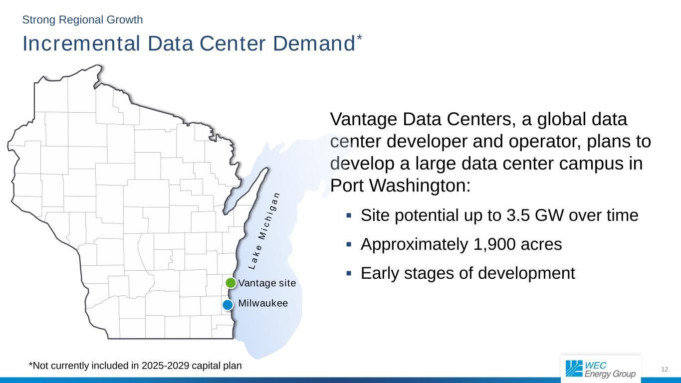 11 1,800 MW of Additional Demand through 2029 “The most important thing for people in Wisconsin to know is that we’re fully on track with construction on our datacenter in Mt. Pleasant, it’s still expected to go online in 2026, and our $3.3 billion commitment remains intact. We are committed to our projects to help prepare the workforce and Wisconsin manufacturers for the future.” – Microsoft Spokesperson March 2025  2,300 construction jobs  2,000 permanent jobs over time  More than 2,000 acres purchased to date © Mark Hertzberg Strong Regional Growth ‘Mount Pleasant AI data center will be among the world’s most advanced’ –Brad Smith, President of Microsoft BizTimes Milwaukee Image of Microsoft area 3B representing 315 acres