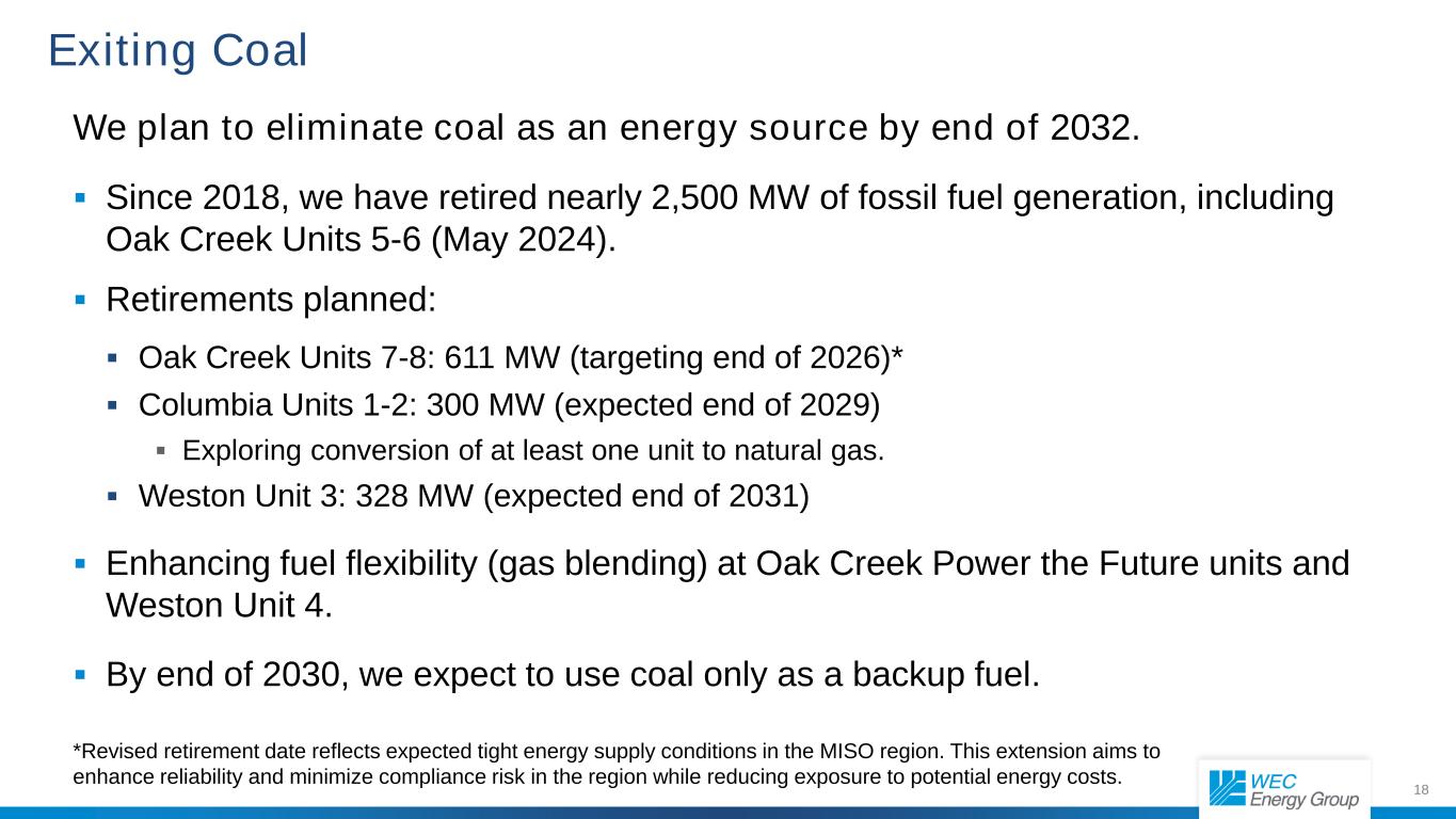 17 Diverse Portfolio of Businesses 63% 16% 4% 7% 10% WI IL MI/MN WECI ATC* By Jurisdiction By Business 49% 32% 2% 7% 10% Electric generation and distribution Natural gas distribution LNG (distribution and generation) WECI Electric transmission* Based on average asset base *ATC is accounted for using the equity method; this represents WEC Energy Group’s portion of the asset base. 57%24% 4% 5% 10% 71% 10% 4% 5% 10% 2029E Asset base $48.8 billion 2024A Asset base $30.8 billion 9.6% CAGR