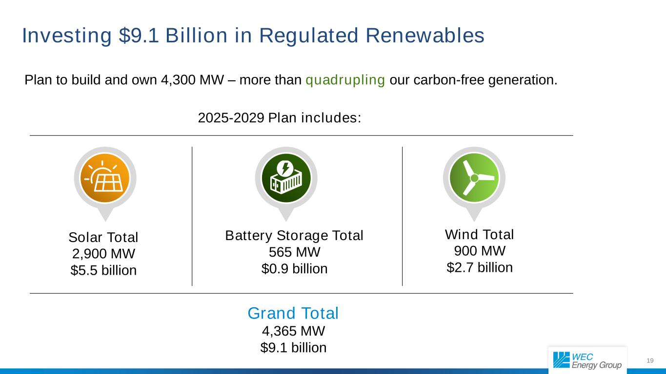 18 Exiting Coal We plan to eliminate coal as an energy source by end of 2032.  Since 2018, we have retired nearly 2,500 MW of fossil fuel generation, including Oak Creek Units 5-6 (May 2024).  Retirements planned:  Oak Creek Units 7-8: 611 MW (targeting end of 2026)*  Columbia Units 1-2: 300 MW (expected end of 2029)  Exploring conversion of at least one unit to natural gas.  Weston Unit 3: 328 MW (expected end of 2031)  Enhancing fuel flexibility (gas blending) at Oak Creek Power the Future units and Weston Unit 4.  By end of 2030, we expect to use coal only as a backup fuel. *Revised retirement date reflects expected tight energy supply conditions in the MISO region. This extension aims to enhance reliability and minimize compliance risk in the region while reducing exposure to potential energy costs.