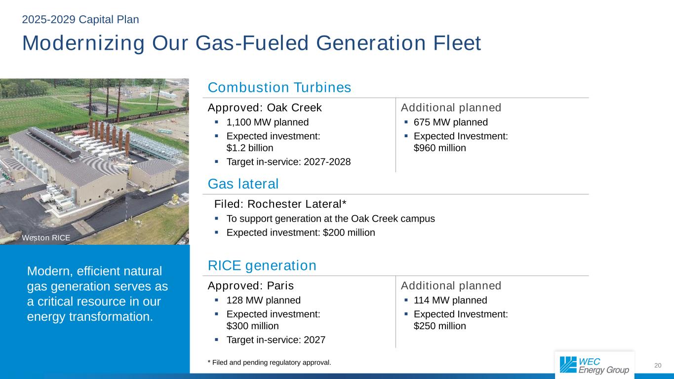 19 Solar Total 2,900 MW $5.5 billion Battery Storage Total 565 MW $0.9 billion Wind Total 900 MW $2.7 billion Grand Total 4,365 MW $9.1 billion 2025-2029 Plan includes: Plan to build and own 4,300 MW – more than quadrupling our carbon-free generation. Investing $9.1 Billion in Regulated Renewables