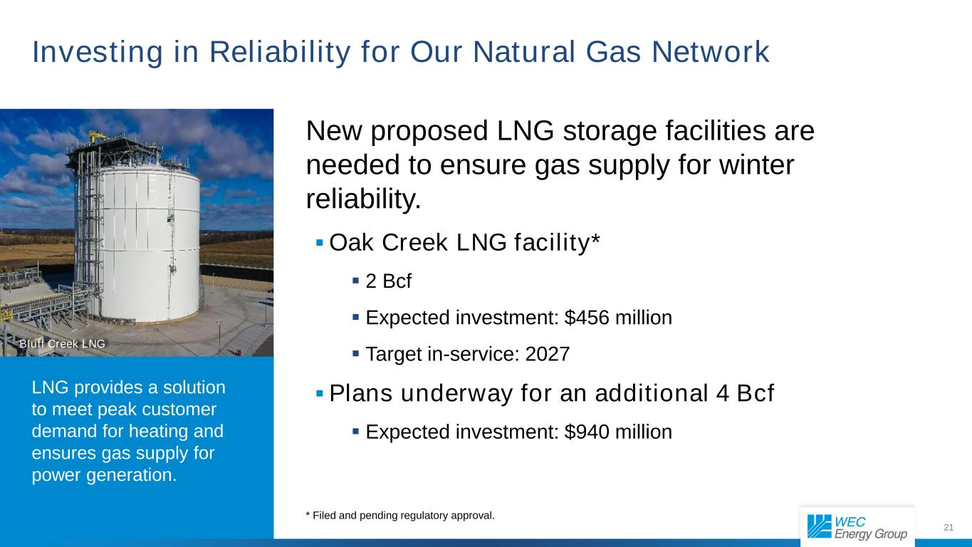 20 Modern, efficient natural gas generation serves as a critical resource in our energy transformation. 2025-2029 Capital Plan Modernizing Our Gas-Fueled Generation Fleet Weston RICE * Filed and pending regulatory approval. Combustion Turbines Approved: Oak Creek  1,100 MW planned  Expected investment: $1.2 billion  Target in-service: 2027-2028 Additional planned  675 MW planned  Expected Investment: $960 million Gas lateral Filed: Rochester Lateral*  To support generation at the Oak Creek campus  Expected investment: $200 million RICE generation Approved: Paris  128 MW planned  Expected investment: $300 million  Target in-service: 2027 Additional planned  114 MW planned  Expected Investment: $250 million