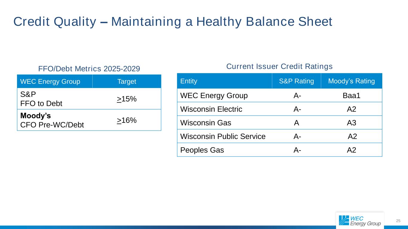 24 Projected Cash Flows and Financing Plan ($ in billions) Cash from Operations $18.5 - $19.5 (60%) Common Equity $2.7 - $3.2 (9%) Dividends $6.8 - $7.0 Capital Plan $24.8 Cash Uses Cash Sources Incremental Debt 2 $9.5 - $10.0 (31%) 1. Excludes ATC’s capital. ATC is accounted for using the equity method. 2. Includes $2.2B - $3.0B of junior subordinated notes or other securities with equity content. 2025-2029 1