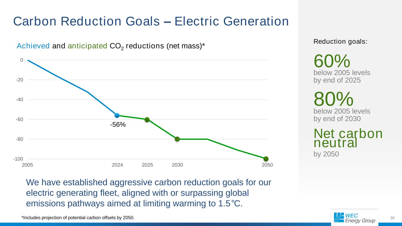 25 Credit Quality – Maintaining a Healthy Balance Sheet Current Issuer Credit Ratings Entity S&P Rating Moody’s Rating WEC Energy Group A- Baa1 Wisconsin Electric A- A2 Wisconsin Gas A A3 Wisconsin Public Service A- A2 Peoples Gas A- A2 FFO/Debt Metrics 2025-2029 WEC Energy Group Target S&P FFO to Debt >15% Moody’s CFO Pre-WC/Debt >16%