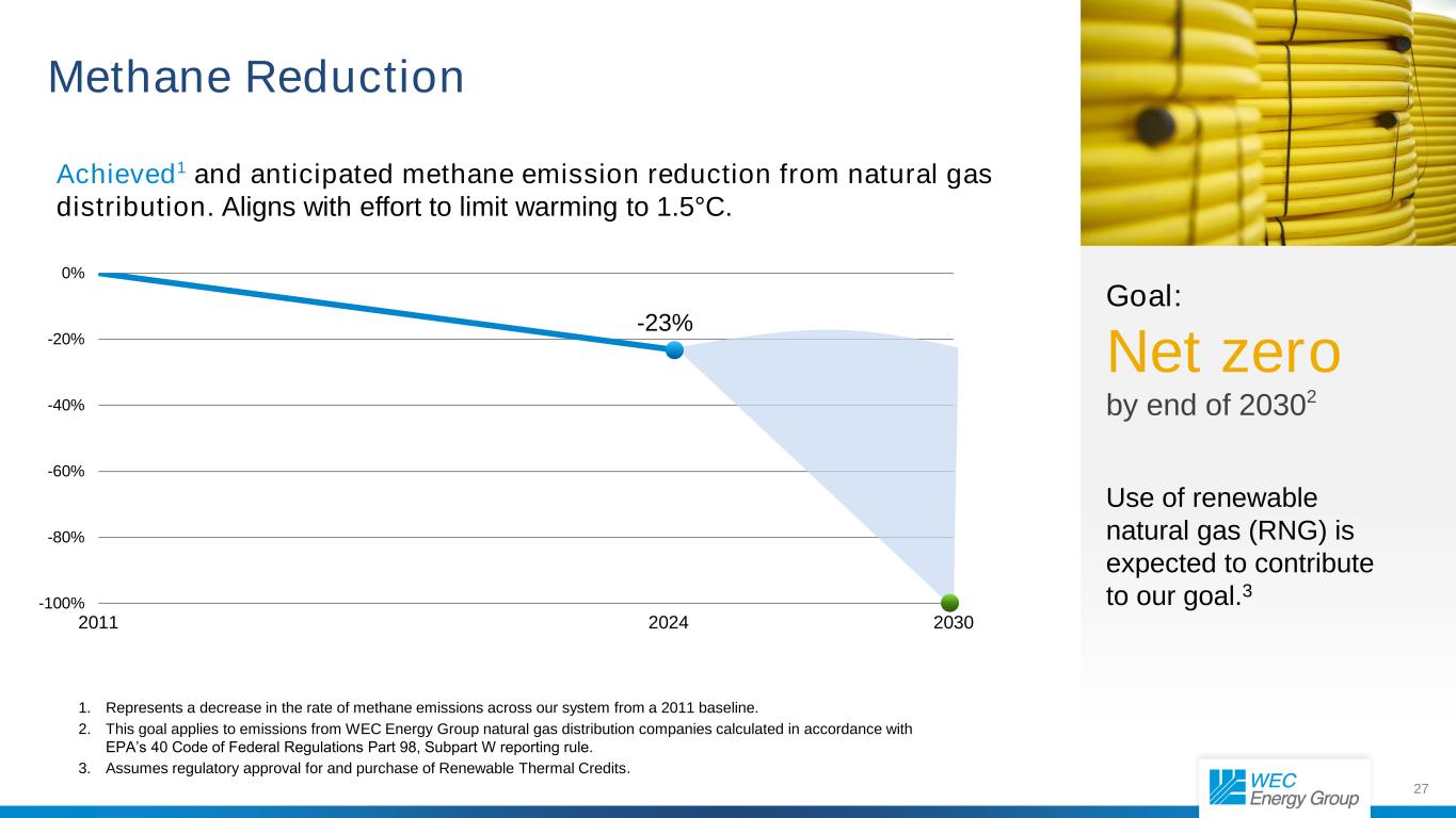 26*Includes projection of potential carbon offsets by 2050. Carbon Reduction Goals – Electric Generation We have established aggressive carbon reduction goals for our electric generating fleet, aligned with or surpassing global emissions pathways aimed at limiting warming to 1.5°C. Reduction goals: 60% below 2005 levels by end of 2025 80% below 2005 levels by end of 2030 Net carbon neutral by 2050 -100 -80 -60 -40 -20 0 2005 2024 2025 2030 2050 Achieved and anticipated CO2 reductions (net mass)* -56%