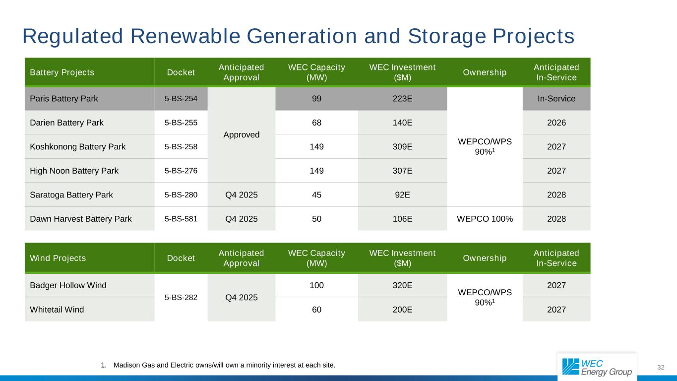 31 Solar Projects Docket Anticipated Approval WEC Capacity (MW) WEC Investment ($M) Ownership Anticipated In-Service Darien Solar Park 5-BS-255 Approved 225 427E WEPCO/ WPS 90%1 In-Service Koshkonong Solar Park 5-BS-258 270 621E 2026 High Noon Solar Park 5-BS-276 270 576E 2027 Ursa Solar Park 5-BS-280 Q4 2025 180 406E 2027 Saratoga Solar Park 135 314E 2028 Dawn Harvest Solar 5-BS-281 Q4 2025 135 303E 2028 Good Oak Solar Park 5-CE-159 Q1 2026 88 194E 2028 Gristmill Solar Park 60 130E 2028 Renegade Solar U-21081 Approved 100 226E UMERC 100% 2026 Regulated Renewable Generation and Storage Projects 1. Madison Gas and Electric owns/will own a minority interest at each site.