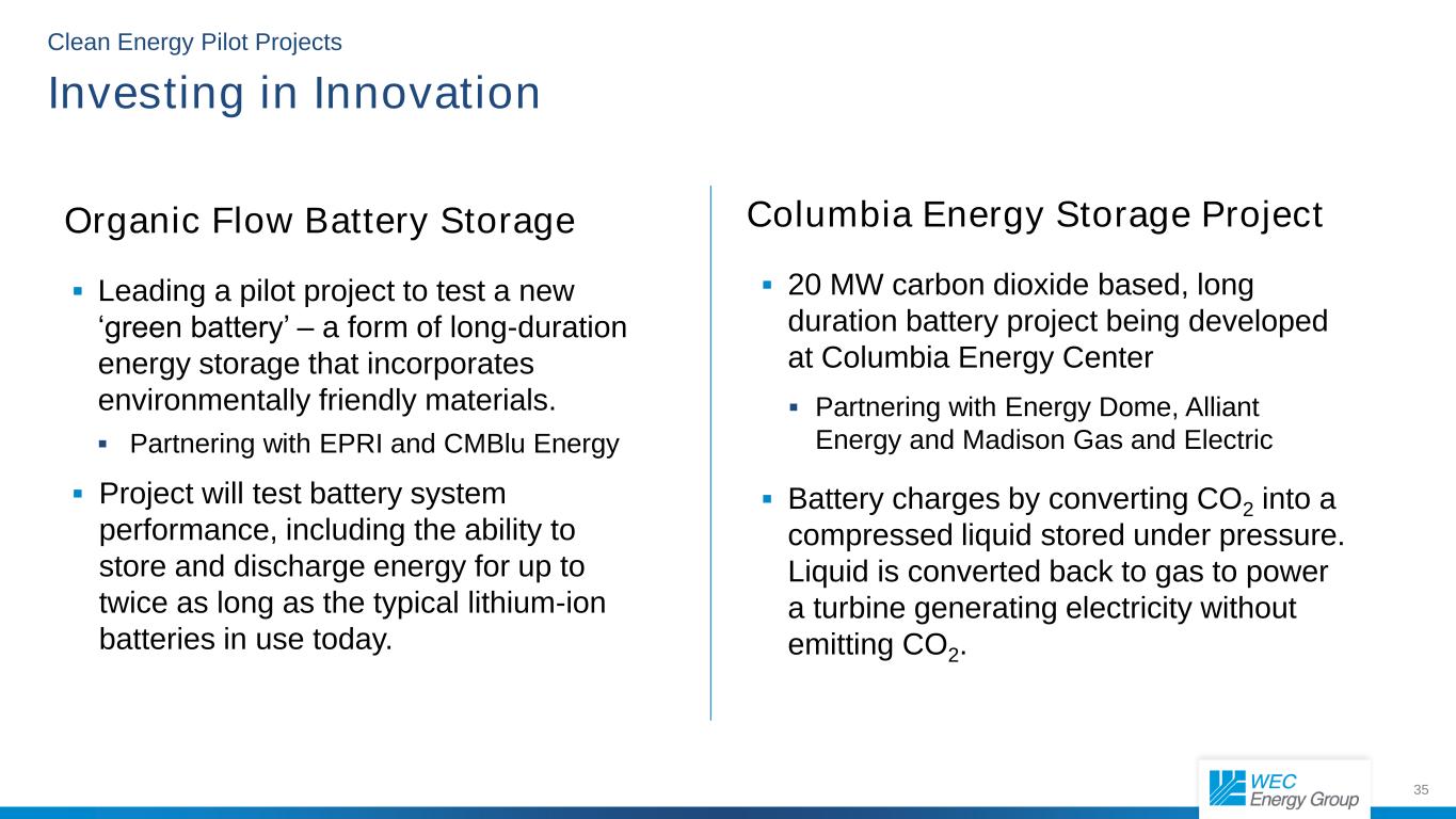 35 Clean Energy Pilot Projects Investing in Innovation Organic Flow Battery Storage  Leading a pilot project to test a new ‘green battery’ – a form of long-duration energy storage that incorporates environmentally friendly materials.  Partnering with EPRI and CMBlu Energy  Project will test battery system performance, including the ability to store and discharge energy for up to twice as long as the typical lithium-ion batteries in use today. Columbia Energy Storage Project  20 MW carbon dioxide based, long duration battery project being developed at Columbia Energy Center  Partnering with Energy Dome, Alliant Energy and Madison Gas and Electric  Battery charges by converting CO2 into a compressed liquid stored under pressure. Liquid is converted back to gas to power a turbine generating electricity without emitting CO2.