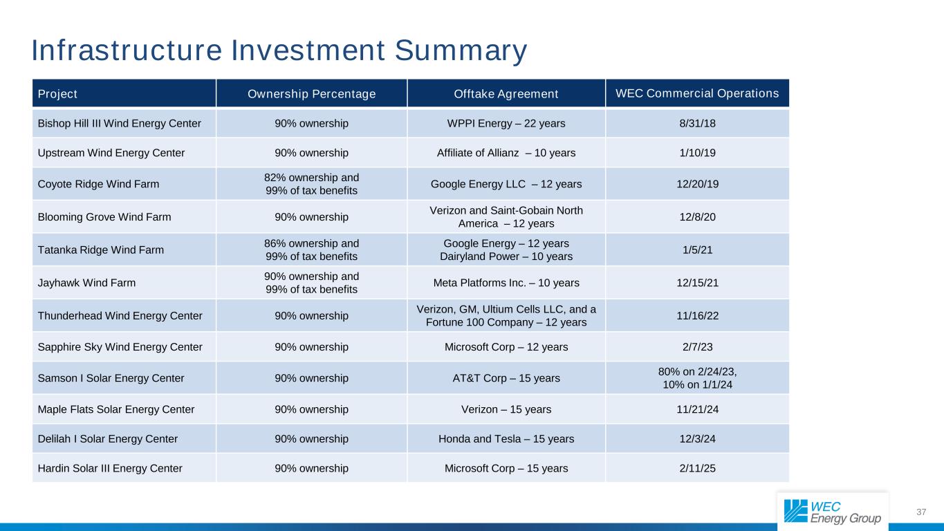 36 In service 1. Investment is part of the 2025-2029 capital plan. Total Project Capacity (MW) Investment (in millions) Wind ● Upstream 200 $307 ● Bishop Hill III 132 166 ● Coyote Ridge 97 145 ● Blooming Grove 250 389 ● Tatanka Ridge 155 240 ● Jayhawk 190 282 ● Thunderhead 300 381 ● Sapphire Sky 250 442 Solar ● Samson I 250 278 ● Maple Flats 250 431 ● Delilah I 300 462 ● Hardin III1 250 406 Total 2,624 $3,929 SD IL NE KS TX OH WEC Infrastructure Portfolio