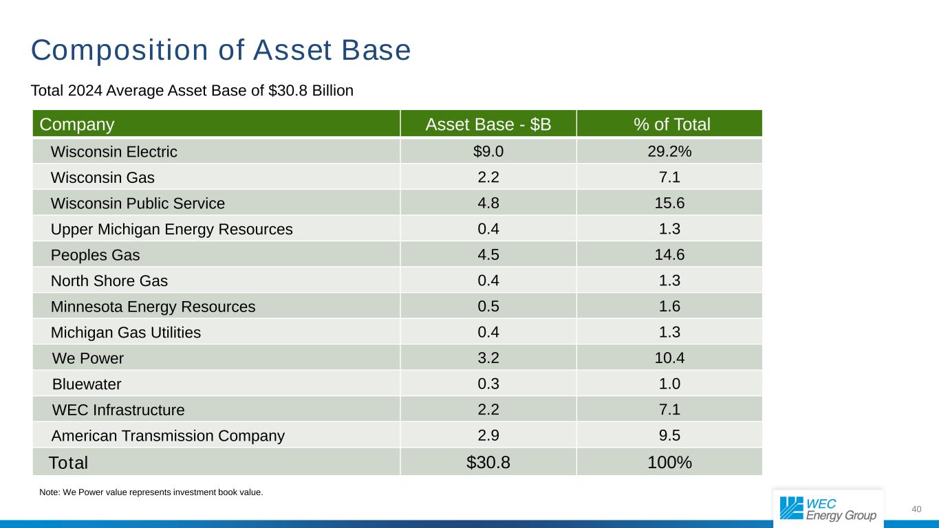 39 Company 2025 2026 2027 Wisconsin Electric $3,047.3 $3,281.2 $3,501.6 Wisconsin Gas 216.0 283.9 288.8 Wisconsin Public Service 801.8 806.4 1,063.5 Upper Michigan Energy 137.3 39.2 19.3 Wisconsin Segment $4,202.4 $4,410.7 $4,873.2 Peoples Gas 321.6 343.5 322.8 North Shore Gas 52.1 61.3 46.9 Illinois Segment $373.7 $404.8 $369.7 Minnesota Energy Resources 57.6 66.1 74.4 Michigan Gas Utilities 48.9 55.3 49.0 Other States Segment $106.5 $121.4 $123.4 We Power 27.7 21.3 32.7 Bluewater 2.6 1.8 1.1 Infrastructure Investments 407.3 0.0 0.0 Nonutility Energy Infrastructure $437.6 $23.1 $33.8 Corporate and Other $17.9 $10.2 $2.4 Subtotal $5,138.1 $4,970.2 $5,402.5 ATC Investment* $486.9 $544.9 $679.8 Total WEC Capital Projection $5,625.0 $5,515.1 $6,082.3 Capital Plan Projections ($ in millions) * ATC is accounted for using the equity method; this represents WEC Energy Group’s portion of the investment.