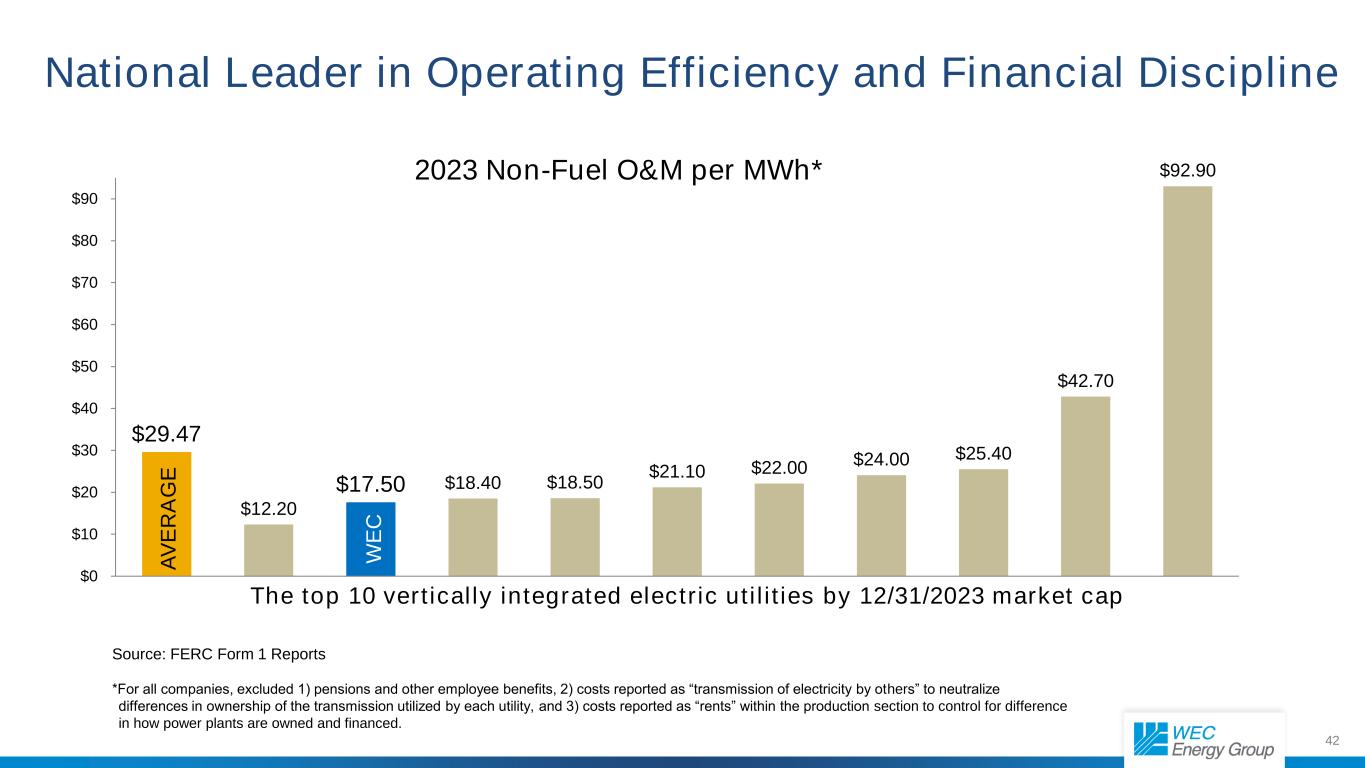 42 National Leader in Operating Efficiency and Financial Discipline $29.47 $12.20 $17.50 $18.40 $18.50 $21.10 $22.00 $24.00 $25.40 $42.70 $92.90 $0 $10 $20 $30 $40 $50 $60 $70 $80 $90 2023 Non-Fuel O&M per MWh* Source: FERC Form 1 Reports *For all companies, excluded 1) pensions and other employee benefits, 2) costs reported as “transmission of electricity by others” to neutralize differences in ownership of the transmission utilized by each utility, and 3) costs reported as “rents” within the production section to control for difference in how power plants are owned and financed. The top 10 vertically integrated electric utilities by 12/31/2023 market cap W E C A V E R A G E