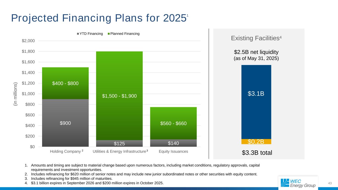 43 Projected Financing Plans for 20251 $900 $125 $140 $400 - $800 $1,500 - $1,900 $560 - $660 $0 $200 $400 $600 $800 $1,000 $1,200 $1,400 $1,600 $1,800 $2,000 Holding Company Utilities & Energy Infrastructure Equity Issuances (i n m ill io n s ) YTD Financing Planned Financing Existing Facilities4 $2.5B net liquidity (as of May 31, 2025) $3.1B $0.2B $3.3B total 1. Amounts and timing are subject to material change based upon numerous factors, including market conditions, regulatory approvals, capital requirements and investment opportunities. 2. Includes refinancing for $620 million of senior notes and may include new junior subordinated notes or other securities with equity content. 3. Includes refinancing for $945 million of maturities. 4. $3.1 billion expires in September 2026 and $200 million expires in October 2025. 2 3