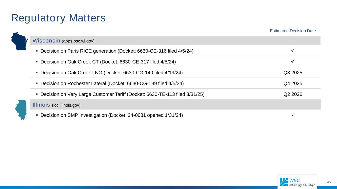 45 Estimated Decision Date Wisconsin (apps.psc.wi.gov)  Decision on Paris RICE generation (Docket: 6630-CE-316 filed 4/5/24)   Decision on Oak Creek CT (Docket: 6630-CE-317 filed 4/5/24)   Decision on Oak Creek LNG (Docket: 6630-CG-140 filed 4/19/24) Q3 2025  Decision on Rochester Lateral (Docket: 6630-CG-139 filed 4/5/24) Q4 2025  Decision on Very Large Customer Tariff (Docket: 6630-TE-113 filed 3/31/25) Q2 2026 Illinois (icc.illinois.gov)  Decision on SMP Investigation (Docket: 24-0081 opened 1/31/24)  Regulatory Matters