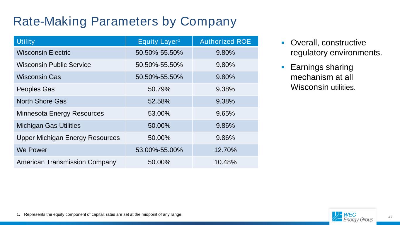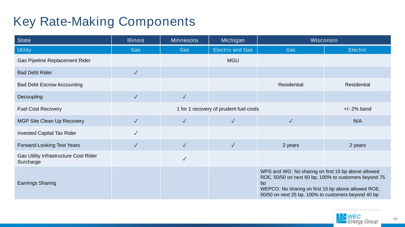 47 Rate-Making Parameters by Company Utility Equity Layer1 Authorized ROE Wisconsin Electric 50.50%-55.50% 9.80% Wisconsin Public Service 50.50%-55.50% 9.80% Wisconsin Gas 50.50%-55.50% 9.80% Peoples Gas 50.79% 9.38% North Shore Gas 52.58% 9.38% Minnesota Energy Resources 53.00% 9.65% Michigan Gas Utilities 50.00% 9.86% Upper Michigan Energy Resources 50.00% 9.86% We Power 53.00%-55.00% 12.70% American Transmission Company 50.00% 10.48% 1. Represents the equity component of capital; rates are set at the midpoint of any range.  Overall, constructive regulatory environments.  Earnings sharing mechanism at all Wisconsin utilities.