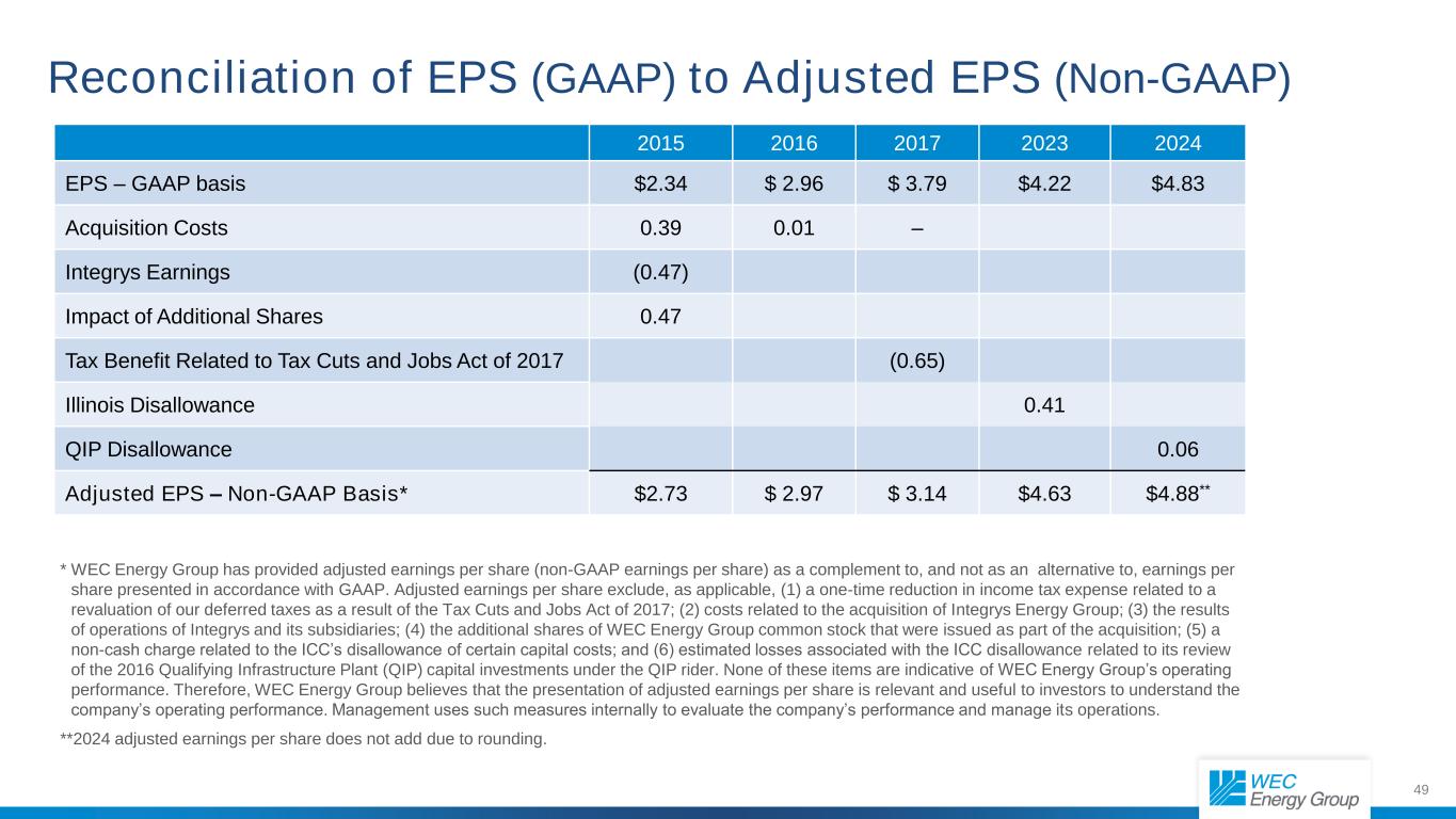 49 Reconciliation of EPS (GAAP) to Adjusted EPS (Non-GAAP) 2015 2016 2017 2023 2024 EPS – GAAP basis $2.34 $ 2.96 $ 3.79 $4.22 $4.83 Acquisition Costs 0.39 0.01 – Integrys Earnings (0.47) Impact of Additional Shares 0.47 Tax Benefit Related to Tax Cuts and Jobs Act of 2017 (0.65) Illinois Disallowance 0.41 QIP Disallowance 0.06 Adjusted EPS – Non-GAAP Basis* $2.73 $ 2.97 $ 3.14 $4.63 $4.88** * WEC Energy Group has provided adjusted earnings per share (non-GAAP earnings per share) as a complement to, and not as an alternative to, earnings per share presented in accordance with GAAP. Adjusted earnings per share exclude, as applicable, (1) a one-time reduction in income tax expense related to a revaluation of our deferred taxes as a result of the Tax Cuts and Jobs Act of 2017; (2) costs related to the acquisition of Integrys Energy Group; (3) the results of operations of Integrys and its subsidiaries; (4) the additional shares of WEC Energy Group common stock that were issued as part of the acquisition; (5) a non-cash charge related to the ICC’s disallowance of certain capital costs; and (6) estimated losses associated with the ICC disallowance related to its review of the 2016 Qualifying Infrastructure Plant (QIP) capital investments under the QIP rider. None of these items are indicative of WEC Energy Group’s operating performance. Therefore, WEC Energy Group believes that the presentation of adjusted earnings per share is relevant and useful to investors to understand the company’s operating performance. Management uses such measures internally to evaluate the company’s performance and manage its operations. **2024 adjusted earnings per share does not add due to rounding.