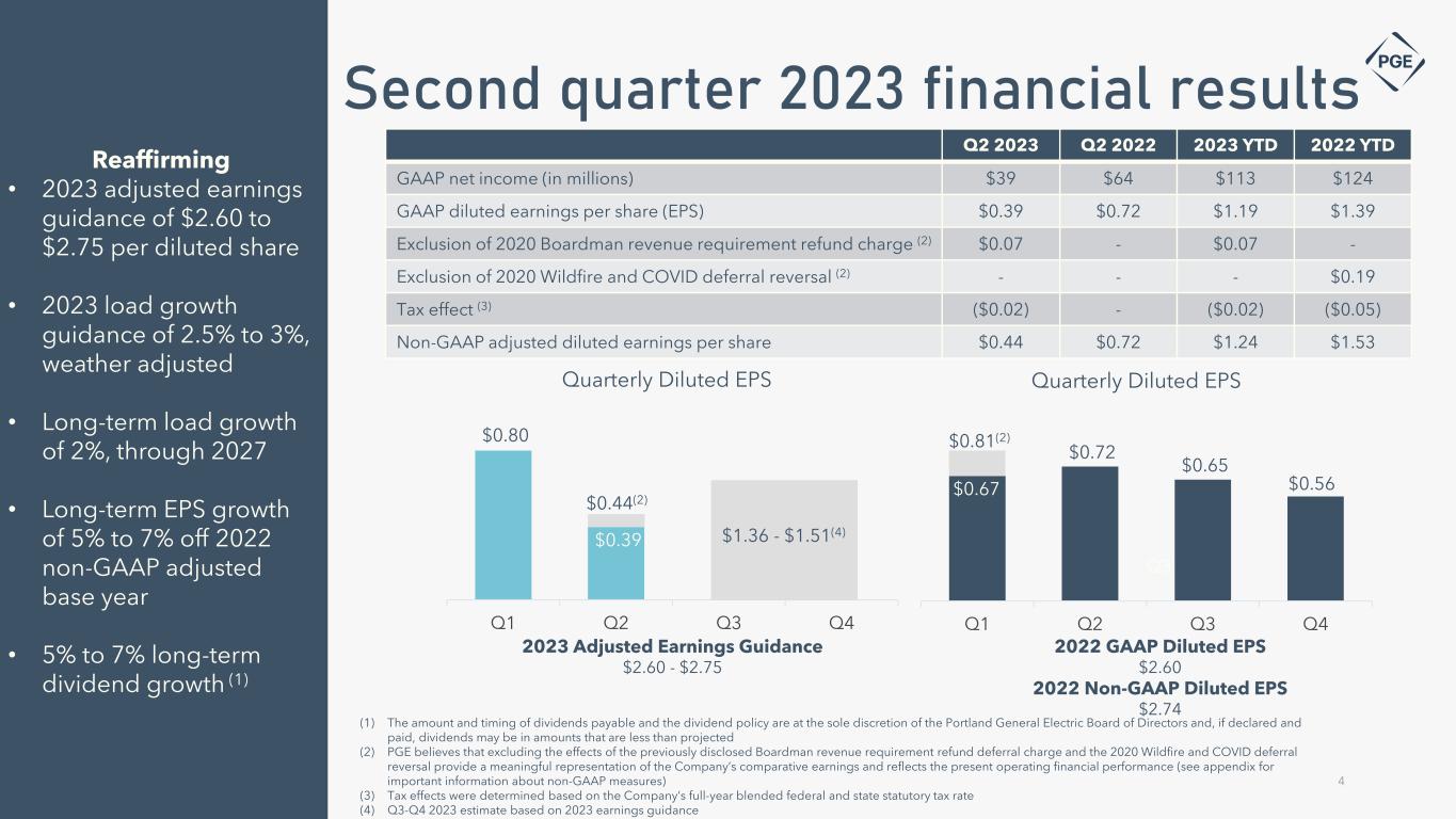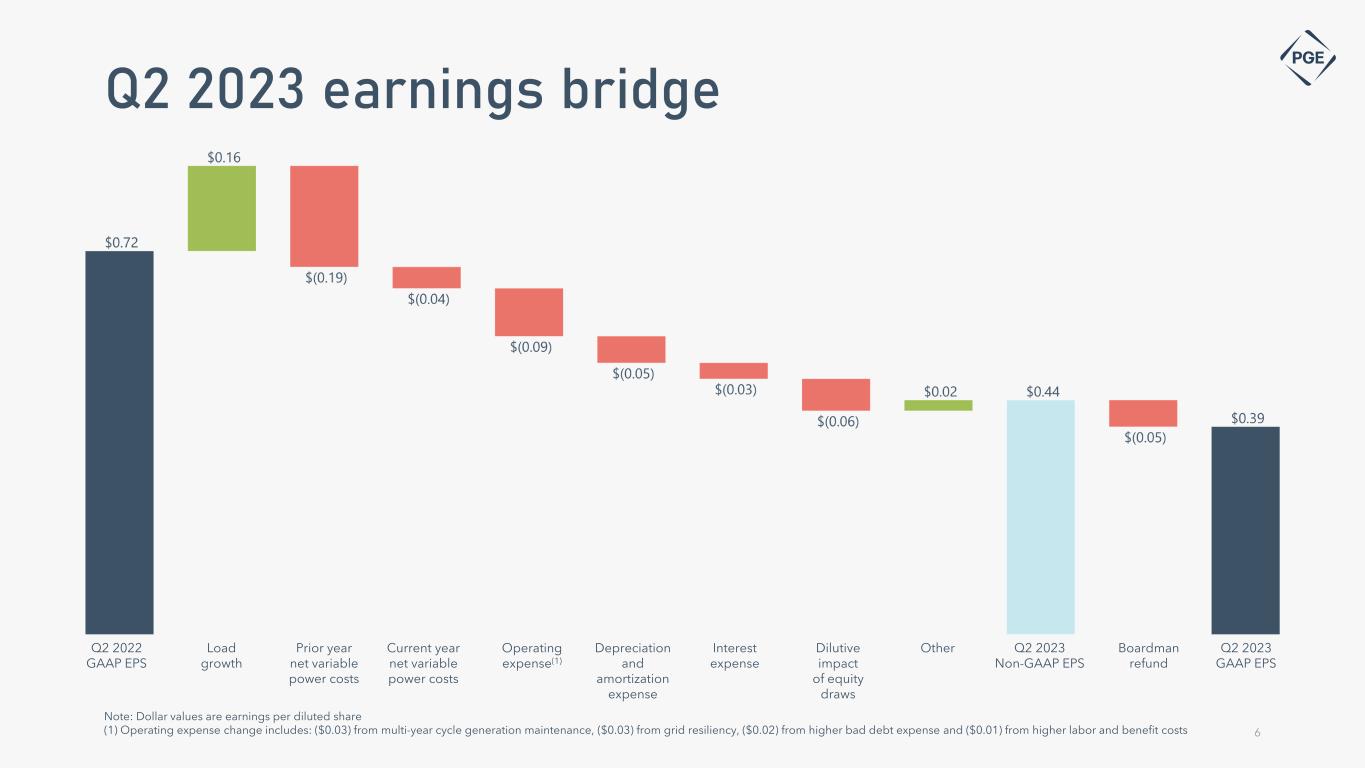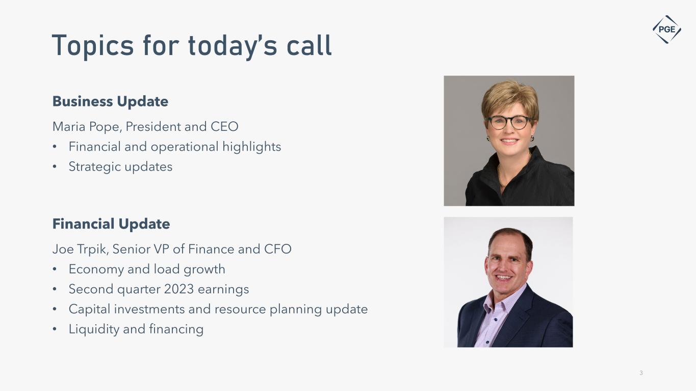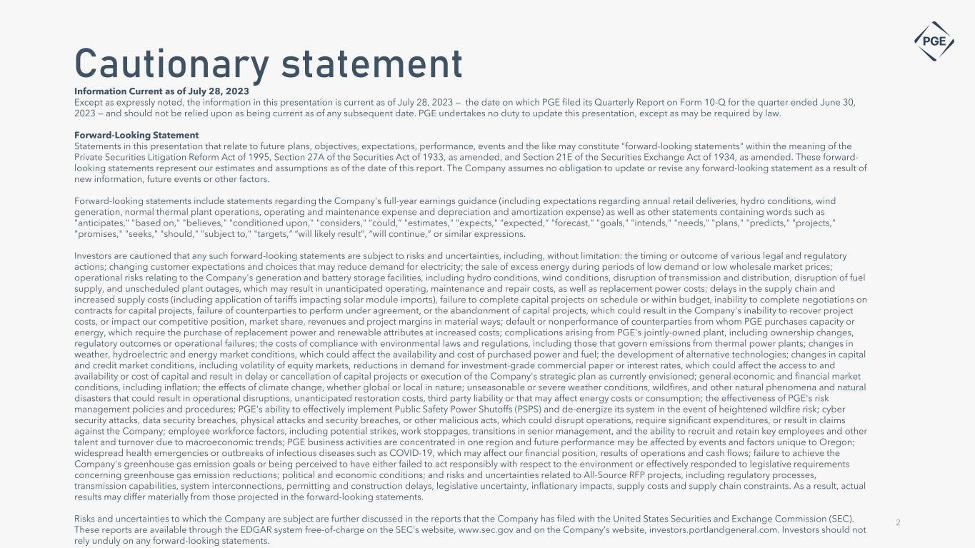 Cautionary statement Information Current as of July 28, 2023 Except as expressly noted, the information in this presentation is current as of July 28, 2023 — the date on which PGE filed its Quarterly Report on Form 10-Q for the quarter ended June 30, 2023 — and should not be relied upon as being current as of any subsequent date. PGE undertakes no duty to update this presentation, except as may be required by law. Forward-Looking Statement Statements in this presentation that relate to future plans, objectives, expectations, performance, events and the like may constitute "forward-looking statements" within the meaning of the Private Securities Litigation Reform Act of 1995, Section 27A of the Securities Act of 1933, as amended, and Section 21E of the Securities Exchange Act of 1934, as amended. These forward- looking statements represent our estimates and assumptions as of the date of this report. The Company assumes no obligation to update or revise any forward-looking statement as a result of new information, future events or other factors. Forward-looking statements include statements regarding the Company's full-year earnings guidance (including expectations regarding annual retail deliveries, hydro conditions, wind generation, normal thermal plant operations, operating and maintenance expense and depreciation and amortization expense) as well as other statements containing words such as "anticipates," "based on," "believes," "conditioned upon," "considers," “could,” "estimates," "expects," “expected,” "forecast," "goals," "intends," "needs," "plans," "predicts," "projects," "promises," "seeks," "should," "subject to," "targets,“ “will likely result”, “will continue,” or similar expressions. Investors are cautioned that any such forward-looking statements are subject to risks and uncertainties, including, without limitation: the timing or outcome of various legal and regulatory actions; changing customer expectations and choices that may reduce demand for electricity; the sale of excess energy during periods of low demand or low wholesale market prices; operational risks relating to the Company's generation and battery storage facilities, including hydro conditions, wind conditions, disruption of transmission and distribution, disruption of fuel supply, and unscheduled plant outages, which may result in unanticipated operating, maintenance and repair costs, as well as replacement power costs; delays in the supply chain and increased supply costs (including application of tariffs impacting solar module imports), failure to complete capital projects on schedule or within budget, inability to complete negotiations on contracts for capital projects, failure of counterparties to perform under agreement, or the abandonment of capital projects, which could result in the Company's inability to recover project costs, or impact our competitive position, market share, revenues and project margins in material ways; default or nonperformance of counterparties from whom PGE purchases capacity or energy, which require the purchase of replacement power and renewable attributes at increased costs; complications arising from PGE's jointly-owned plant, including ownership changes, regulatory outcomes or operational failures; the costs of compliance with environmental laws and regulations, including those that govern emissions from thermal power plants; changes in weather, hydroelectric and energy market conditions, which could affect the availability and cost of purchased power and fuel; the development of alternative technologies; changes in capital and credit market conditions, including volatility of equity markets, reductions in demand for investment-grade commercial paper or interest rates, which could affect the access to and availability or cost of capital and result in delay or cancellation of capital projects or execution of the Company's strategic plan as currently envisioned; general economic and financial market conditions, including inflation; the effects of climate change, whether global or local in nature; unseasonable or severe weather conditions, wildfires, and other natural phenomena and natural disasters that could result in operational disruptions, unanticipated restoration costs, third party liability or that may affect energy costs or consumption; the effectiveness of PGE's risk management policies and procedures; PGE's ability to effectively implement Public Safety Power Shutoffs (PSPS) and de-energize its system in the event of heightened wildfire risk; cyber security attacks, data security breaches, physical attacks and security breaches, or other malicious acts, which could disrupt operations, require significant expenditures, or result in claims against the Company; employee workforce factors, including potential strikes, work stoppages, transitions in senior management, and the ability to recruit and retain key employees and other talent and turnover due to macroeconomic trends; PGE business activities are concentrated in one region and future performance may be affected by events and factors unique to Oregon; widespread health emergencies or outbreaks of infectious diseases such as COVID-19, which may affect our financial position, results of operations and cash flows; failure to achieve the Company's greenhouse gas emission goals or being perceived to have either failed to act responsibly with respect to the environment or effectively responded to legislative requirements concerning greenhouse gas emission reductions; political and economic conditions; and risks and uncertainties related to All-Source RFP projects, including regulatory processes, transmission capabilities, system interconnections, permitting and construction delays, legislative uncertainty, inflationary impacts, supply costs and supply chain constraints. As a result, actual results may differ materially from those projected in the forward-looking statements. Risks and uncertainties t