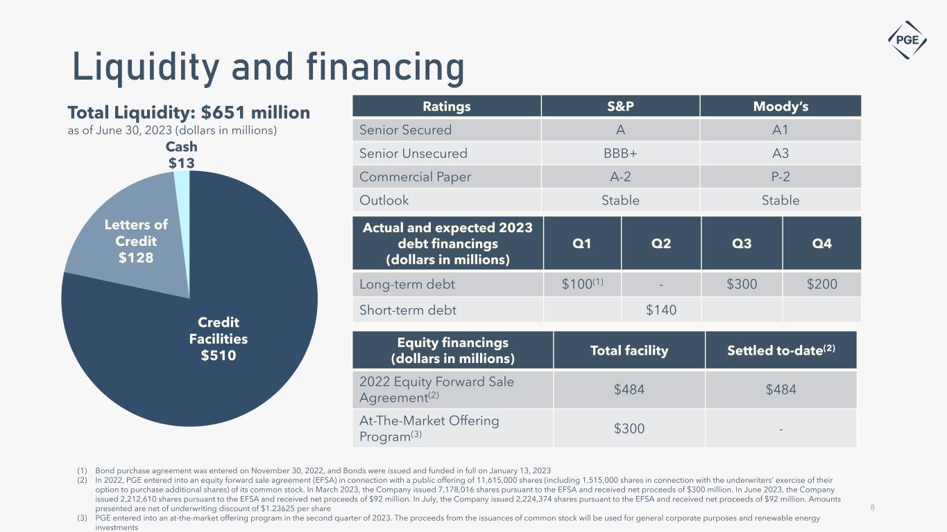 Note: Dollar values in millions. Capital expenditures exclude allowance for funds used during construction. These are projections based on assumptions of future investment. Actual amounts expended will depend on various factors and may differ materially from the amounts reflected in this capital expenditure forecast (1) Values presented do not include incremental potential investments for future RFP cycles Reliability and resiliency investments Capital expenditures forecast(1) $165 $150 $150 $150 $150 $600 $560 $570 $570 $570 $180 $100 $80 $80 $80 $415 $40 $110 $75 $130 $155 2023 2024 2025 2026 2027 Generation T&D General, Technology, Strategic Clearwater Wind Evergreen Battery Seaside Battery $800$800 $1,475 $1,050 $955 7