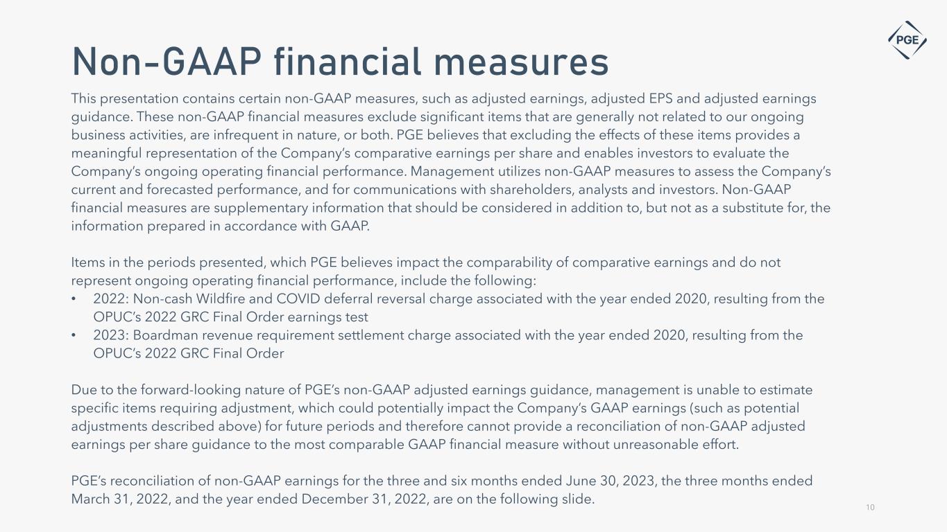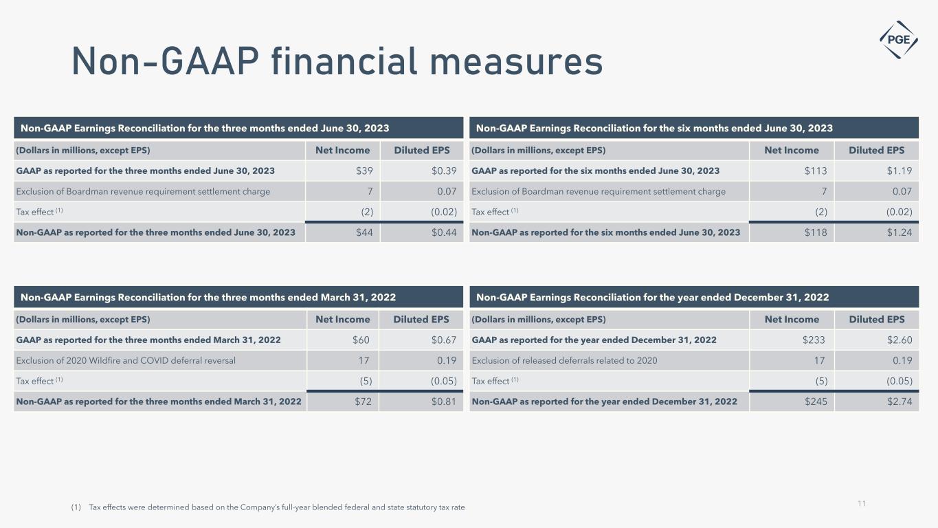 This presentation contains certain non-GAAP measures, such as adjusted earnings, adjusted EPS and adjusted earnings guidance. These non-GAAP financial measures exclude significant items that are generally not related to our ongoing business activities, are infrequent in nature, or both. PGE believes that excluding the effects of these items provides a meaningful representation of the Company’s comparative earnings per share and enables investors to evaluate the Company’s ongoing operating financial performance. Management utilizes non-GAAP measures to assess the Company’s current and forecasted performance, and for communications with shareholders, analysts and investors. Non-GAAP financial measures are supplementary information that should be considered in addition to, but not as a substitute for, the information prepared in accordance with GAAP. Items in the periods presented, which PGE believes impact the comparability of comparative earnings and do not represent ongoing operating financial performance, include the following: • 2022: Non-cash Wildfire and COVID deferral reversal charge associated with the year ended 2020, resulting from the OPUC’s 2022 GRC Final Order earnings test • 2023: Boardman revenue requirement settlement charge associated with the year ended 2020, resulting from the OPUC’s 2022 GRC Final Order Due to the forward-looking nature of PGE’s non-GAAP adjusted earnings guidance, management is unable to estimate specific items requiring adjustment, which could potentially impact the Company’s GAAP earnings (such as potential adjustments described above) for future periods and therefore cannot provide a reconciliation of non-GAAP adjusted earnings per share guidance to the most comparable GAAP financial measure without unreasonable effort. PGE’s reconciliation of non-GAAP earnings for the three and six months ended June 30, 2023, the three months ended March 31, 2022, and the year ended December 31, 2022, are on the following slide. 10 Non-GAAP financial measures