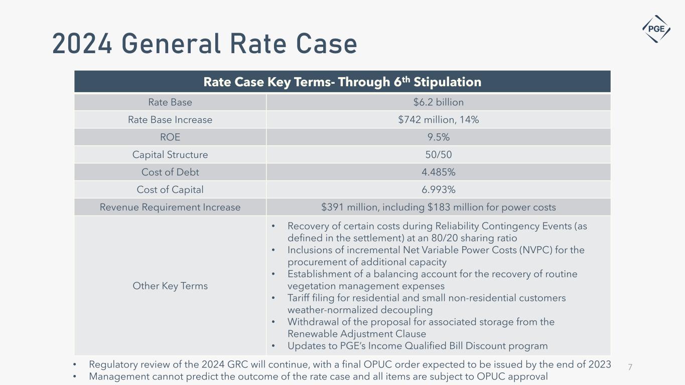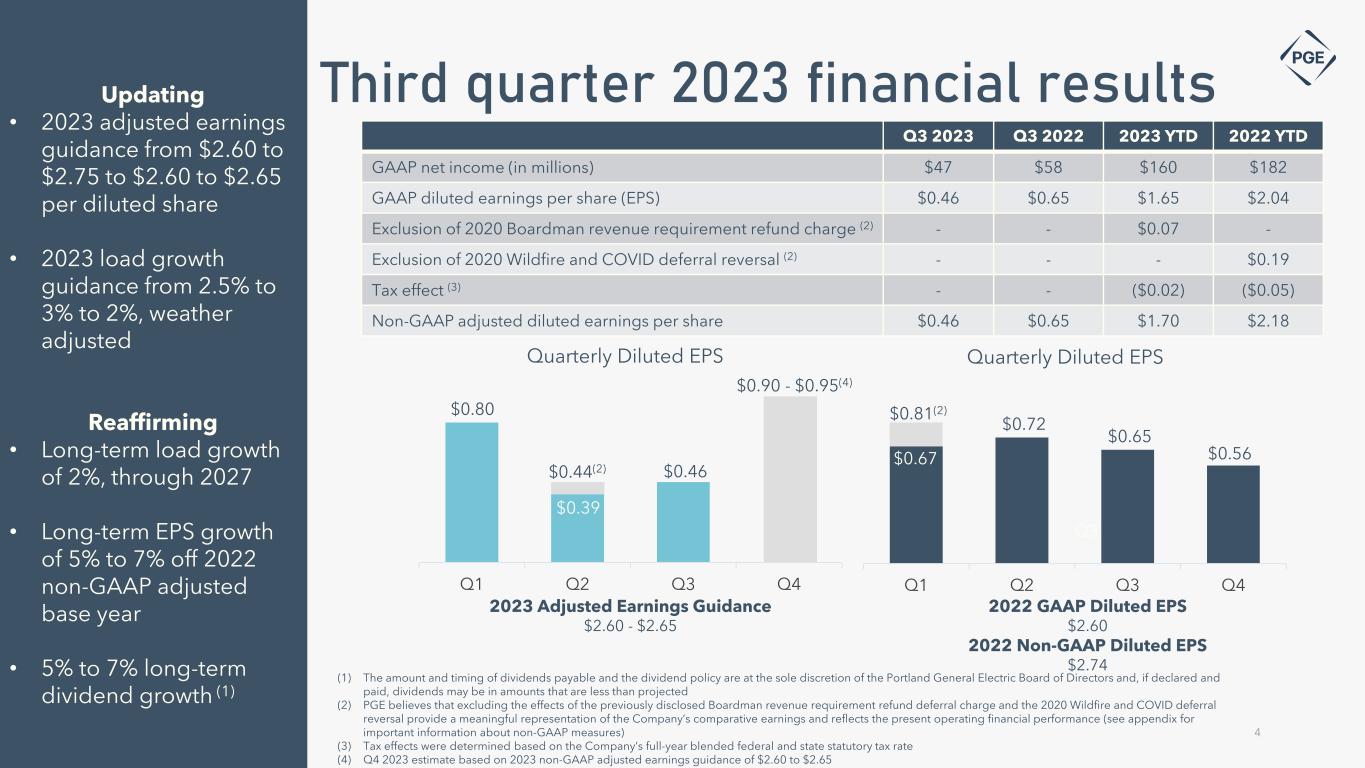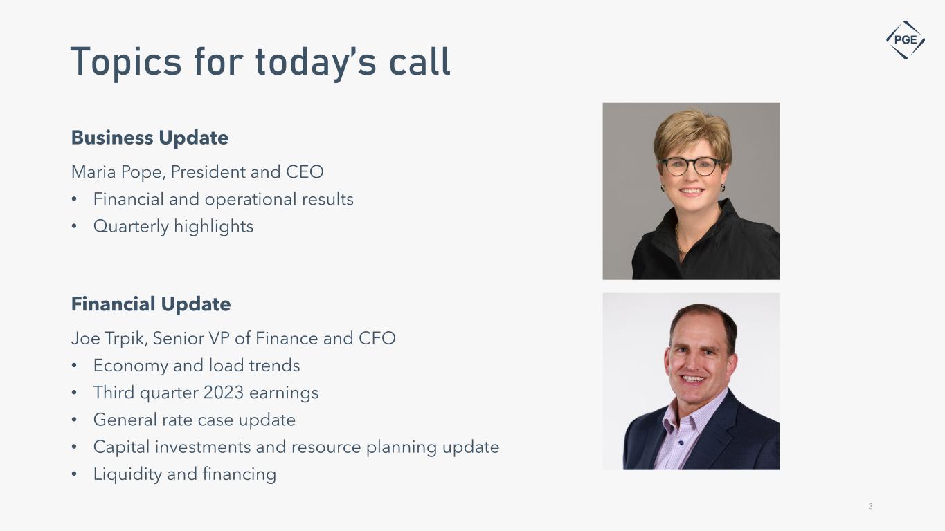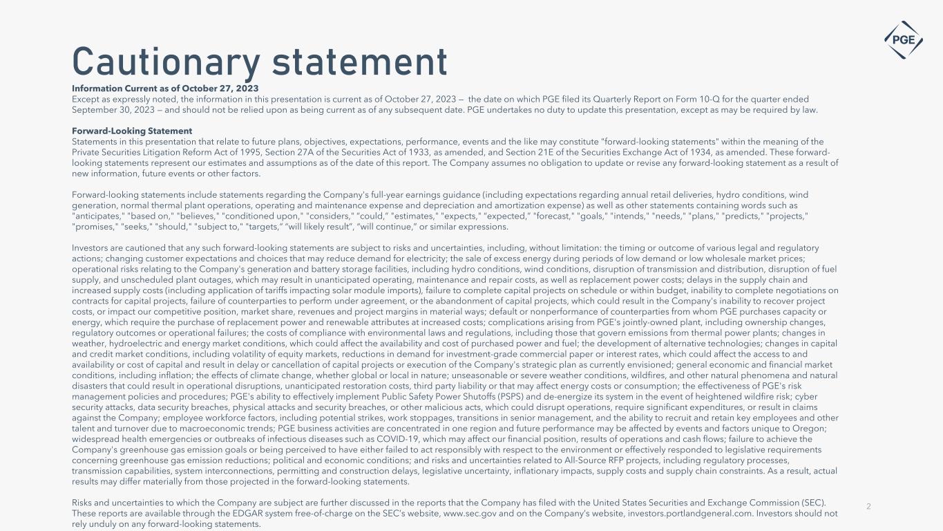 Cautionary statement Information Current as of October 27, 2023 Except as expressly noted, the information in this presentation is current as of October 27, 2023 — the date on which PGE filed its Quarterly Report on Form 10-Q for the quarter ended September 30, 2023 — and should not be relied upon as being current as of any subsequent date. PGE undertakes no duty to update this presentation, except as may be required by law. Forward-Looking Statement Statements in this presentation that relate to future plans, objectives, expectations, performance, events and the like may constitute "forward-looking statements" within the meaning of the Private Securities Litigation Reform Act of 1995, Section 27A of the Securities Act of 1933, as amended, and Section 21E of the Securities Exchange Act of 1934, as amended. These forward- looking statements represent our estimates and assumptions as of the date of this report. The Company assumes no obligation to update or revise any forward-looking statement as a result of new information, future events or other factors. Forward-looking statements include statements regarding the Company's full-year earnings guidance (including expectations regarding annual retail deliveries, hydro conditions, wind generation, normal thermal plant operations, operating and maintenance expense and depreciation and amortization expense) as well as other statements containing words such as "anticipates," "based on," "believes," "conditioned upon," "considers," “could,” "estimates," "expects," “expected,” "forecast," "goals," "intends," "needs," "plans," "predicts," "projects," "promises," "seeks," "should," "subject to," "targets,“ “will likely result”, “will continue,” or similar expressions. Investors are cautioned that any such forward-looking statements are subject to risks and uncertainties, including, without limitation: the timing or outcome of various legal and regulatory actions; changing customer expectations and choices that may reduce demand for electricity; the sale of excess energy during periods of low demand or low wholesale market prices; operational risks relating to the Company's generation and battery storage facilities, including hydro conditions, wind conditions, disruption of transmission and distribution, disruption of fuel supply, and unscheduled plant outages, which may result in unanticipated operating, maintenance and repair costs, as well as replacement power costs; delays in the supply chain and increased supply costs (including application of tariffs impacting solar module imports), failure to complete capital projects on schedule or within budget, inability to complete negotiations on contracts for capital projects, failure of counterparties to perform under agreement, or the abandonment of capital projects, which could result in the Company's inability to recover project costs, or impact our competitive position, market share, revenues and project margins in material ways; default or nonperformance of counterparties from whom PGE purchases capacity or energy, which require the purchase of replacement power and renewable attributes at increased costs; complications arising from PGE's jointly-owned plant, including ownership changes, regulatory outcomes or operational failures; the costs of compliance with environmental laws and regulations, including those that govern emissions from thermal power plants; changes in weather, hydroelectric and energy market conditions, which could affect the availability and cost of purchased power and fuel; the development of alternative technologies; changes in capital and credit market conditions, including volatility of equity markets, reductions in demand for investment-grade commercial paper or interest rates, which could affect the access to and availability or cost of capital and result in delay or cancellation of capital projects or execution of the Company's strategic plan as currently envisioned; general economic and financial market conditions, including inflation; the effects of climate change, whether global or local in nature; unseasonable or severe weather conditions, wildfires, and other natural phenomena and natural disasters that could result in operational disruptions, unanticipated restoration costs, third party liability or that may affect energy costs or consumption; the effectiveness of PGE's risk management policies and procedures; PGE's ability to effectively implement Public Safety Power Shutoffs (PSPS) and de-energize its system in the event of heightened wildfire risk; cyber security attacks, data security breaches, physical attacks and security breaches, or other malicious acts, which could disrupt operations, require significant expenditures, or result in claims against the Company; employee workforce factors, including potential strikes, work stoppages, transitions in senior management, and the ability to recruit and retain key employees and other talent and turnover due to macroeconomic trends; PGE business activities are concentrated in one region and future performance may be affected by events and factors unique to Oregon; widespread health emergencies or outbreaks of infectious diseases such as COVID-19, which may affect our financial position, results of operations and cash flows; failure to achieve the Company's greenhouse gas emission goals or being perceived to have either failed to act responsibly with respect to the environment or effectively responded to legislative requirements concerning greenhouse gas emission reductions; political and economic conditions; and risks and uncertainties related to All-Source RFP projects, including regulatory processes, transmission capabilities, system interconnections, permitting and construction delays, legislative uncertainty, inflationary impacts, supply costs and supply chain constraints. As a result, actual results may differ materially from those projected in the forward-looking statements. Risks and unce