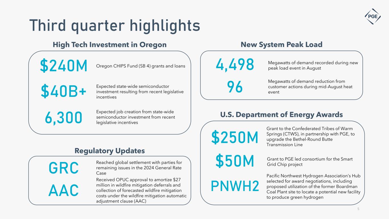 $0.80 $0.39 $0.46 Q1 Q2 Q3 Q4 Quarterly Diluted EPS $0.44(2) $0.90 - $0.95(4) $0.67 $0.72 $0.65 $0.56 Q1 Q2 Q3 Q4 Quarterly Diluted EPS $0.81(2) Q3 2023 Q3 2022 2023 YTD 2022 YTD GAAP net income (in millions) $47 $58 $160 $182 GAAP diluted earnings per share (EPS) $0.46 $0.65 $1.65 $2.04 Exclusion of 2020 Boardman revenue requirement refund charge (2) - - $0.07 - Exclusion of 2020 Wildfire and COVID deferral reversal (2) - - - $0.19 Tax effect (3) - - ($0.02) ($0.05) Non-GAAP adjusted diluted earnings per share $0.46 $0.65 $1.70 $2.18 (1) The amount and timing of dividends payable and the dividend policy are at the sole discretion of the Portland General Electric Board of Directors and, if declared and paid, dividends may be in amounts that are less than projected (2) PGE believes that excluding the effects of the previously disclosed Boardman revenue requirement refund deferral charge and the 2020 Wildfire and COVID deferral reversal provide a meaningful representation of the Company’s comparative earnings and reflects the present operating financial performance (see appendix for important information about non-GAAP measures) (3) Tax effects were determined based on the Company’s full-year blended federal and state statutory tax rate (4) Q4 2023 estimate based on 2023 non-GAAP adjusted earnings guidance of $2.60 to $2.65 Third quarter 2023 financial results 4 Updating • 2023 adjusted earnings guidance from $2.60 to $2.75 to $2.60 to $2.65 per diluted share • 2023 load growth guidance from 2.5% to 3% to 2%, weather adjusted Reaffirming • Long-term load growth of 2%, through 2027 • Long-term EPS growth of 5% to 7% off 2022 non-GAAP adjusted base year • 5% to 7% long-term dividend growth (1) Q3 2022 GAAP Diluted EPS $2.60 2022 Non-GAAP Diluted EPS $2.74 2023 Adjusted Earnings Guidance $2.60 - $2.65