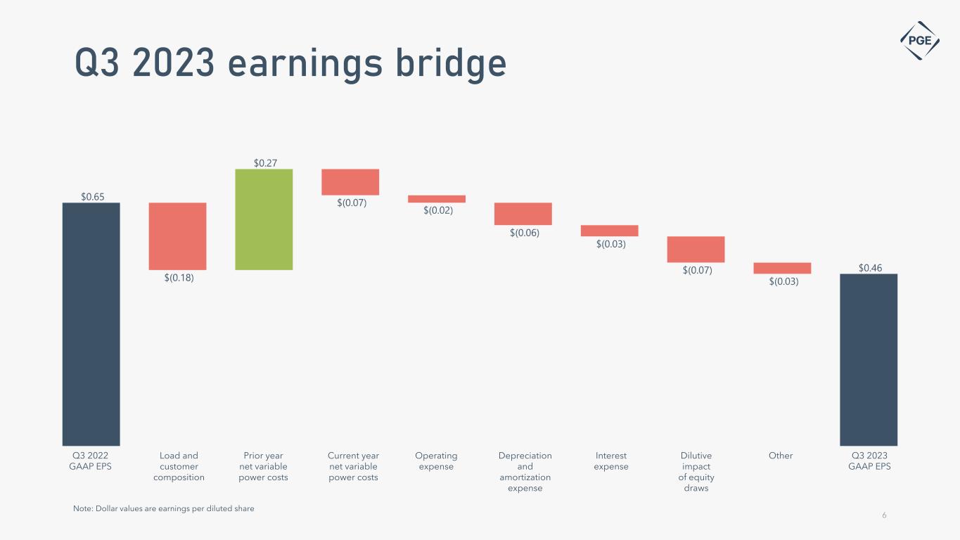 Third quarter highlights 5 High Tech Investment in Oregon Expected job creation from state-wide semiconductor investment from recent legislative incentives Expected state-wide semiconductor investment resulting from recent legislative incentives$40B+ 6,300 Oregon CHIPS Fund (SB 4) grants and loans$240M U.S. Department of Energy Awards Pacific Northwest Hydrogen Association’s Hub selected for award negotiations, including proposed utilization of the former Boardman Coal Plant site to locate a potential new facility to produce green hydrogen Grant to PGE led consortium for the Smart Grid Chip project$50M PNWH2 Grant to the Confederated Tribes of Warm Springs (CTWS), in partnership with PGE, to upgrade the Bethel-Round Butte Transmission Line $250M New System Peak Load Megawatts of demand reduction from customer actions during mid-August heat event96 Megawatts of demand recorded during new peak load event in August4,498 Regulatory Updates Received OPUC approval to amortize $27 million in wildfire mitigation deferrals and collection of forecasted wildfire mitigation costs under the wildfire mitigation automatic adjustment clause (AAC) AAC Reached global settlement with parties for remaining issues in the 2024 General Rate CaseGRC