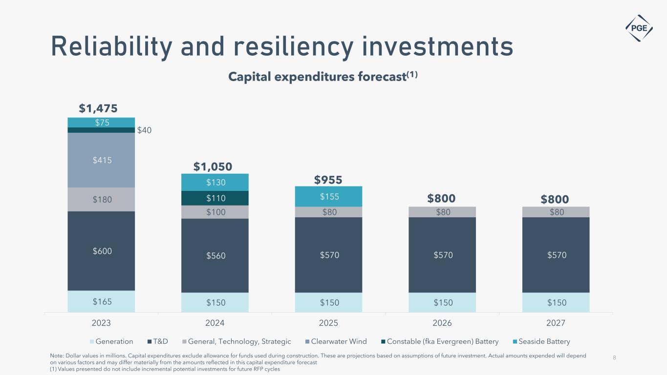2024 General Rate Case Rate Case Key Terms- Through 6th Stipulation Rate Base $6.2 billion Rate Base Increase $742 million, 14% ROE 9.5% Capital Structure 50/50 Cost of Debt 4.485% Cost of Capital 6.993% Revenue Requirement Increase $391 million, including $183 million for power costs Other Key Terms • Recovery of certain costs during Reliability Contingency Events (as defined in the settlement) at an 80/20 sharing ratio • Inclusions of incremental Net Variable Power Costs (NVPC) for the procurement of additional capacity • Establishment of a balancing account for the recovery of routine vegetation management expenses • Tariff filing for residential and small non-residential customers weather-normalized decoupling • Withdrawal of the proposal for associated storage from the Renewable Adjustment Clause • Updates to PGE’s Income Qualified Bill Discount program 7• Regulatory review of the 2024 GRC will continue, with a final OPUC order expected to be issued by the end of 2023 • Management cannot predict the outcome of the rate case and all items are subject to OPUC approval