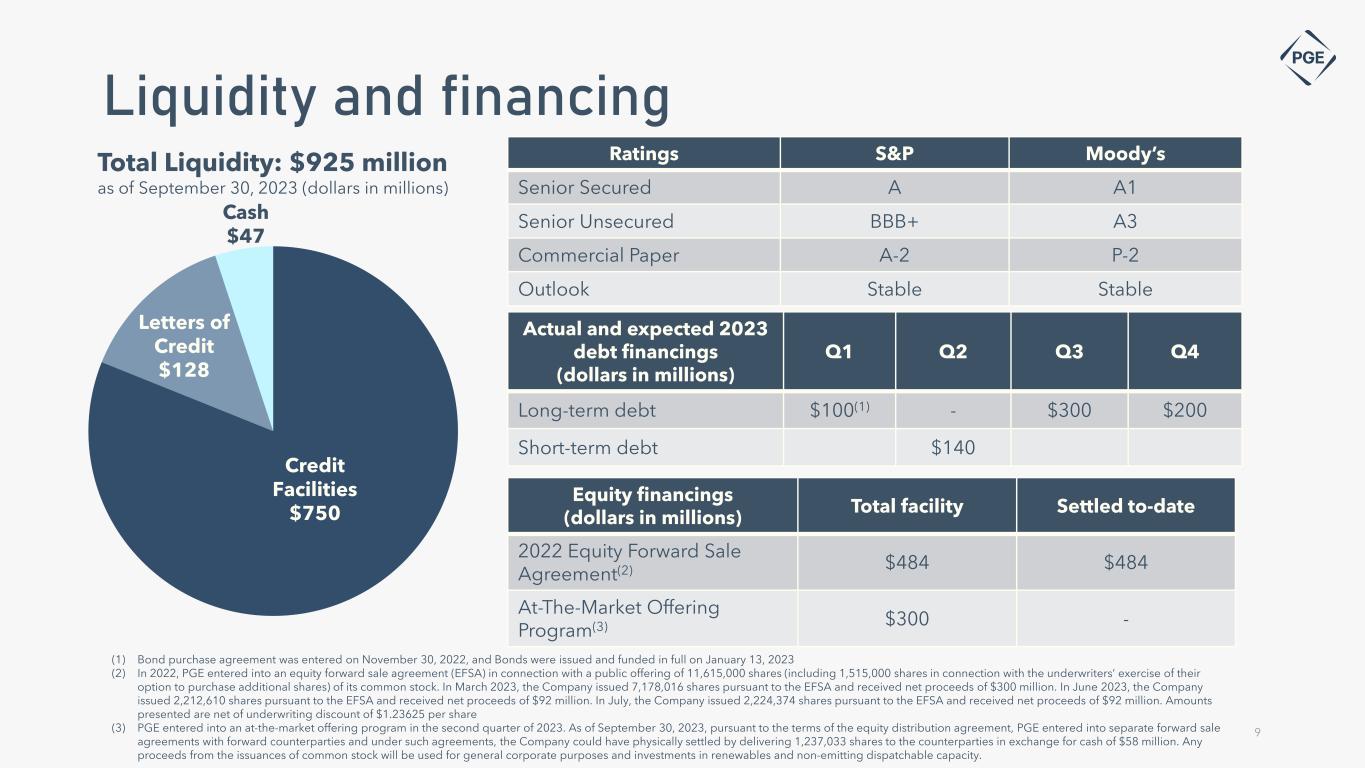 Note: Dollar values in millions. Capital expenditures exclude allowance for funds used during construction. These are projections based on assumptions of future investment. Actual amounts expended will depend on various factors and may differ materially from the amounts reflected in this capital expenditure forecast (1) Values presented do not include incremental potential investments for future RFP cycles Reliability and resiliency investments Capital expenditures forecast(1) $165 $150 $150 $150 $150 $600 $560 $570 $570 $570 $180 $100 $80 $80 $80 $415 $40 $110 $75 $130 $155 2023 2024 2025 2026 2027 Generation T&D General, Technology, Strategic Clearwater Wind Constable (fka Evergreen) Battery Seaside Battery $800$800 $1,475 $1,050 $955 8
