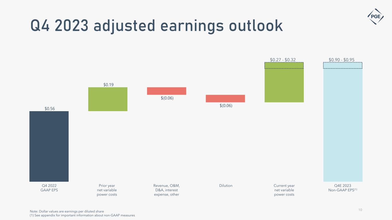 Ratings S&P Moody’s Senior Secured A A1 Senior Unsecured BBB+ A3 Commercial Paper A-2 P-2 Outlook Stable Stable Credit Facilities $750 Letters of Credit $128 Total Liquidity: $925 million as of September 30, 2023 (dollars in millions) Cash $47 Liquidity and financing Actual and expected 2023 debt financings (dollars in millions) Q1 Q2 Q3 Q4 Long-term debt $100(1) - $300 $200 Short-term debt $140 9 Equity financings (dollars in millions) Total facility Settled to-date 2022 Equity Forward Sale Agreement(2) $484 $484 At-The-Market Offering Program(3) $300 - (1) Bond purchase agreement was entered on November 30, 2022, and Bonds were issued and funded in full on January 13, 2023 (2) In 2022, PGE entered into an equity forward sale agreement (EFSA) in connection with a public offering of 11,615,000 shares (including 1,515,000 shares in connection with the underwriters’ exercise of their option to purchase additional shares) of its common stock. In March 2023, the Company issued 7,178,016 shares pursuant to the EFSA and received net proceeds of $300 million. In June 2023, the Company issued 2,212,610 shares pursuant to the EFSA and received net proceeds of $92 million. In July, the Company issued 2,224,374 shares pursuant to the EFSA and received net proceeds of $92 million. Amounts presented are net of underwriting discount of $1.23625 per share (3) PGE entered into an at-the-market offering program in the second quarter of 2023. As of September 30, 2023, pursuant to the terms of the equity distribution agreement, PGE entered into separate forward sale agreements with forward counterparties and under such agreements, the Company could have physically settled by delivering 1,237,033 shares to the counterparties in exchange for cash of $58 million. Any proceeds from the issuances of common stock will be used for general corporate purposes and investments in renewables and non-emitting dispatchable capacity.