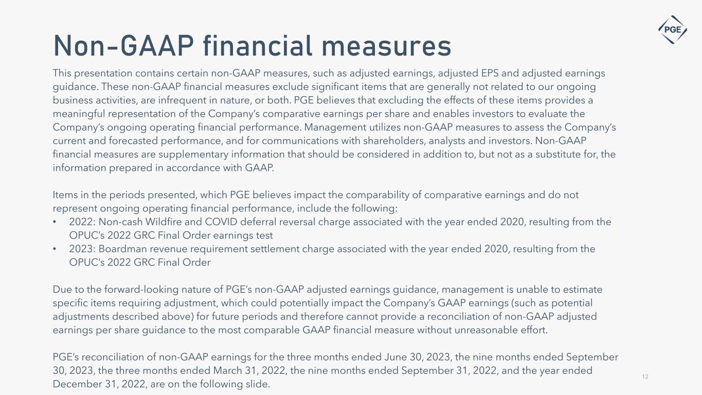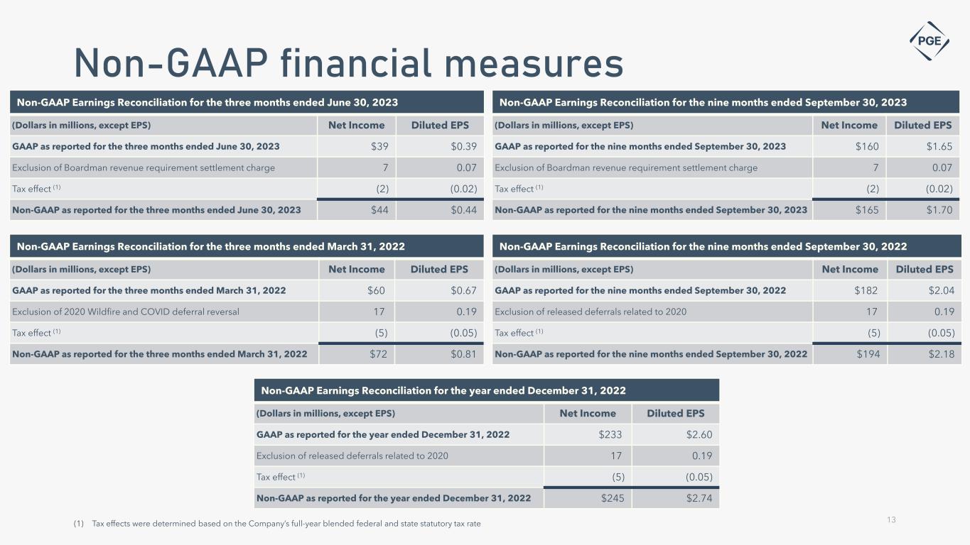 This presentation contains certain non-GAAP measures, such as adjusted earnings, adjusted EPS and adjusted earnings guidance. These non-GAAP financial measures exclude significant items that are generally not related to our ongoing business activities, are infrequent in nature, or both. PGE believes that excluding the effects of these items provides a meaningful representation of the Company’s comparative earnings per share and enables investors to evaluate the Company’s ongoing operating financial performance. Management utilizes non-GAAP measures to assess the Company’s current and forecasted performance, and for communications with shareholders, analysts and investors. Non-GAAP financial measures are supplementary information that should be considered in addition to, but not as a substitute for, the information prepared in accordance with GAAP. Items in the periods presented, which PGE believes impact the comparability of comparative earnings and do not represent ongoing operating financial performance, include the following: • 2022: Non-cash Wildfire and COVID deferral reversal charge associated with the year ended 2020, resulting from the OPUC’s 2022 GRC Final Order earnings test • 2023: Boardman revenue requirement settlement charge associated with the year ended 2020, resulting from the OPUC’s 2022 GRC Final Order Due to the forward-looking nature of PGE’s non-GAAP adjusted earnings guidance, management is unable to estimate specific items requiring adjustment, which could potentially impact the Company’s GAAP earnings (such as potential adjustments described above) for future periods and therefore cannot provide a reconciliation of non-GAAP adjusted earnings per share guidance to the most comparable GAAP financial measure without unreasonable effort. PGE’s reconciliation of non-GAAP earnings for the three months ended June 30, 2023, the nine months ended September 30, 2023, the three months ended March 31, 2022, the nine months ended September 31, 2022, and the year ended December 31, 2022, are on the following slide. 12 Non-GAAP financial measures
