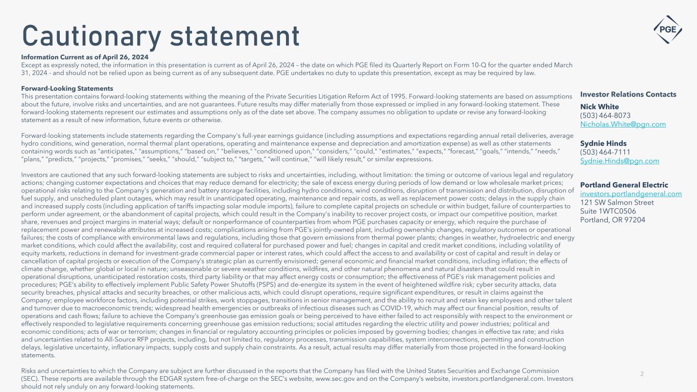Cautionary statement 2 Investor Relations Contacts Information Current as of April 26, 2024 Except as expressly noted, the information in this presentation is current as of April 26, 2024 – the date on which PGE filed its Quarterly Report on Form 10-Q for the quarter ended March 31, 2024 - and should not be relied upon as being current as of any subsequent date. PGE undertakes no duty to update this presentation, except as may be required by law. Forward-Looking Statements This presentation contains forward-looking statements withing the meaning of the Private Securities Litigation Reform Act of 1995. Forward-looking statements are based on assumptions about the future, involve risks and uncertainties, and are not guarantees. Future results may differ materially from those expressed or implied in any forward-looking statement. These forward-looking statements represent our estimates and assumptions only as of the date set above. The company assumes no obligation to update or revise any forward-looking statement as a result of new information, future events or otherwise. Forward-looking statements include statements regarding the Company's full-year earnings guidance (including assumptions and expectations regarding annual retail deliveries, average hydro conditions, wind generation, normal thermal plant operations, operating and maintenance expense and depreciation and amortization expense) as well as other statements containing words such as "anticipates," “assumptions,” “based on,” "believes," "conditioned upon," “considers,” “could,” "estimates," "expects," “forecast,” “goals,” “intends,” “needs,” “plans,” “predicts,” “projects,” “promises,“ “seeks,” "should," “subject to,” “targets,” “will continue,” “will likely result,” or similar expressions. Investors are cautioned that any such forward-looking statements are subject to risks and uncertainties, including, without limitation: the timing or outcome of various legal and regulatory actions; changing customer expectations and choices that may reduce demand for electricity; the sale of excess energy during periods of low demand or low wholesale market prices; operational risks relating to the Company's generation and battery storage facilities, including hydro conditions, wind conditions, disruption of transmission and distribution, disruption of fuel supply, and unscheduled plant outages, which may result in unanticipated operating, maintenance and repair costs, as well as replacement power costs; delays in the supply chain and increased supply costs (including application of tariffs impacting solar module imports), failure to complete capital projects on schedule or within budget, failure of counterparties to perform under agreement, or the abandonment of capital projects, which could result in the Company's inability to recover project costs, or impact our competitive position, market share, revenues and project margins in material ways; default or nonperformance of counterparties from whom PGE purchases capacity or energy, which require the purchase of replacement power and renewable attributes at increased costs; complications arising from PGE’s jointly-owned plant, including ownership changes, regulatory outcomes or operational failures; the costs of compliance with environmental laws and regulations, including those that govern emissions from thermal power plants; changes in weather, hydroelectric and energy market conditions, which could affect the availability, cost and required collateral for purchased power and fuel; changes in capital and credit market conditions, including volatility of equity markets, reductions in demand for investment-grade commercial paper or interest rates, which could affect the access to and availability or cost of capital and result in delay or cancellation of capital projects or execution of the Company’s strategic plan as currently envisioned; general economic and financial market conditions, including inflation; the effects of climate change, whether global or local in nature; unseasonable or severe weather conditions, wildfires, and other natural phenomena and natural disasters that could result in operational disruptions, unanticipated restoration costs, third party liability or that may affect energy costs or consumption; the effectiveness of PGE’s risk management policies and procedures; PGE’s ability to effectively implement Public Safety Power Shutoffs (PSPS) and de-energize its system in the event of heightened wildfire risk; cyber security attacks, data security breaches, physical attacks and security breaches, or other malicious acts, which could disrupt operations, require significant expenditures, or result in claims against the Company; employee workforce factors, including potential strikes, work stoppages, transitions in senior management, and the ability to recruit and retain key employees and other talent and turnover due to macroeconomic trends; widespread health emergencies or outbreaks of infectious diseases such as COVID-19, which may affect our financial position, results of operations and cash flows; failure to achieve the Company’s greenhouse gas emission goals or being perceived to have either failed to act responsibly with respect to the environment or effectively responded to legislative requirements concerning greenhouse gas emission reductions; social attitudes regarding the electric utility and power industries; political and economic conditions; acts of war or terrorism; changes in financial or regulatory accounting principles or policies imposed by governing bodies; changes in effective tax rate; and risks and uncertainties related to All-Source RFP projects, including, but not limited to, regulatory processes, transmission capabilities, system interconnections, permitting and construction delays, legislative uncertainty, inflationary impacts, supply costs and supply chain constraints. 