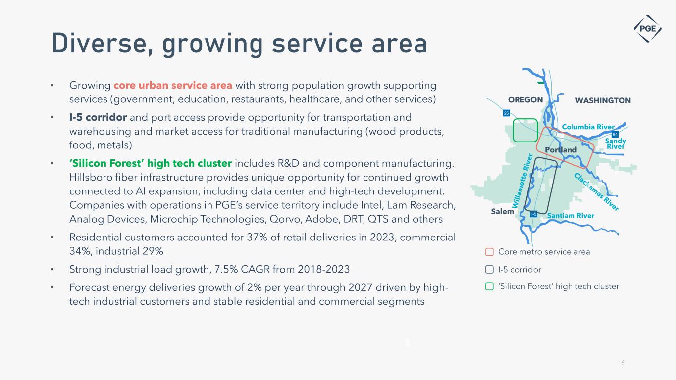 • Urban service territory with strong growth in semiconductor and data center demand • Growing number of customer connects and 2% long-term load growth, through 2027 • Adopting 100% clean energy by 2040 framework • Entered into agreements for 475 MW of battery storage and 500 MW of hydro contracts; 2,700 to 3,700 MW of additional non-emitting resources remain to be procured through multi-stage RFP processes through 2030 • 5% to 7% long-term EPS growth(1) and dividend growth guidance(2) • Improved key safety and reliability metrics • Continuing to implement efficiencies and manage costs through technology • No. 1 ranked renewable power program in the Unites States for 14 years(3) • Ranked as a Top 5 Utility in the United States for Customer Experience according to Forrester’s The US Customer Experience Index for 2021, 2022 and 2023(4) • Investing in our system to maintain and increase resiliency to mitigate against extreme weather and wildfires • Modernizing our grid with a community- centered distribution system to advance environmental justice, accelerate distributed energy resources and maximize grid benefits • Regulatory mechanisms to recover costs and add renewables, including a Renewable Adjustment Clause, Wildfire Mitigation Automatic Adjustment Clause and forward test year • Vertically integrated, regulated utility Investing in a reliable and clean energy future Building a smarter more resilient grid Focusing on operational effectiveness and efficiency High-growth service area Constructive regulatory framework Prioritizing customer service and experience Investment thesis 5 (1) Long-term EPS growth base year is 2022 adjusted results (2) The amount and timing of dividends payable and the dividend policy are at the sole discretion of the Portland General Electric Board of Directors and, if declared and paid, dividends may be in amounts that are materially less than projected. EPS estimates and projections are based on assumptions and there can be no assurance regarding the amount of future earnings consistent with earnings guidance (3) National Renewables Energy Laboratory. NREL did not release rankings in 2011 (4) Forrester’s The US Utilities Customer Experience Index Rankings, 2021-2023. Annual rankings are issued retrospectively for each calendar year