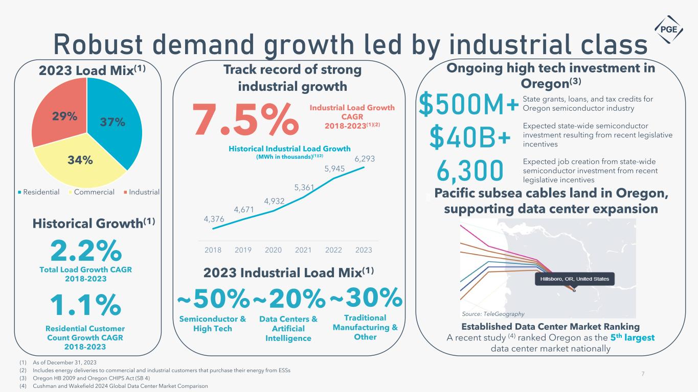 • Growing core urban service area with strong population growth supporting services (government, education, restaurants, healthcare, and other services) • I-5 corridor and port access provide opportunity for transportation and warehousing and market access for traditional manufacturing (wood products, food, metals) • ‘Silicon Forest’ high tech cluster includes R&D and component manufacturing. Hillsboro fiber infrastructure provides unique opportunity for continued growth connected to AI expansion, including data center and high-tech development. Companies with operations in PGE’s service territory include Intel, Lam Research, Analog Devices, Microchip Technologies, Qorvo, Adobe, DRT, QTS and others • Residential customers accounted for 37% of retail deliveries in 2023, commercial 34%, industrial 29% • Strong industrial load growth, 7.5% CAGR from 2018-2023 • Forecast energy deliveries growth of 2% per year through 2027 driven by high- tech industrial customers and stable residential and commercial segments WASHINGTONOREGON I-5 26 84 Columbia River Sandy River Salem Portland 6 Core metro service area I-5 corridor ‘Silicon Forest’ high tech cluster Diverse, growing service area Santiam River