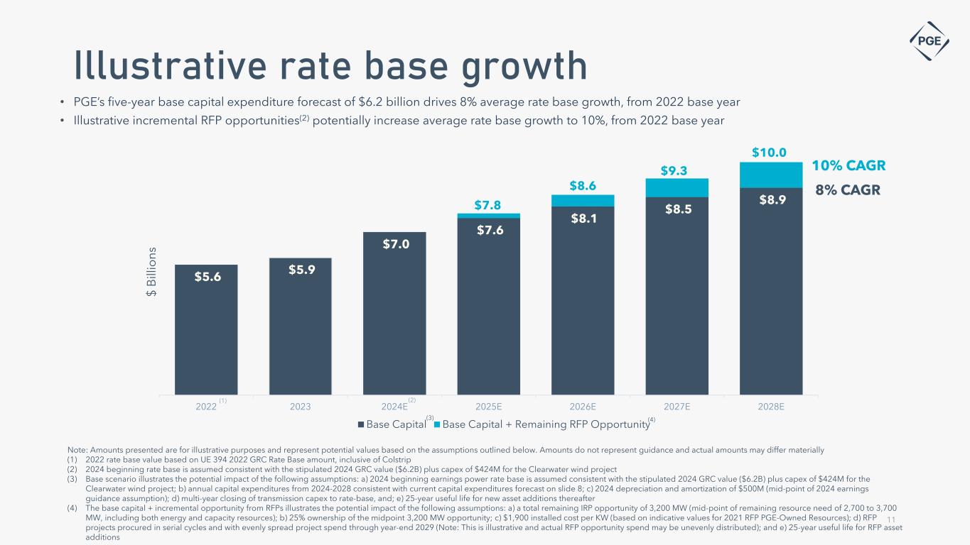 • PGE’s five-year base capital expenditure forecast of $6.2 billion drives 8% average rate base growth, from 2022 base year • Illustrative incremental RFP opportunities(2) potentially increase average rate base growth to 10%, from 2022 base year Note: Amounts presented are for illustrative purposes and represent potential values based on the assumptions outlined below. Amounts do not represent guidance and actual amounts may differ materially (1) 2022 rate base value based on UE 394 2022 GRC Rate Base amount, inclusive of Colstrip (2) 2024 beginning rate base is assumed consistent with the stipulated 2024 GRC value ($6.2B) plus capex of $424M for the Clearwater wind project (3) Base scenario illustrates the potential impact of the following assumptions: a) 2024 beginning earnings power rate base is assumed consistent with the stipulated 2024 GRC value ($6.2B) plus capex of $424M for the Clearwater wind project; b) annual capital expenditures from 2024-2028 consistent with current capital expenditures forecast on slide 8; c) 2024 depreciation and amortization of $500M (mid-point of 2024 earnings guidance assumption); d) multi-year closing of transmission capex to rate-base, and; e) 25-year useful life for new asset additions thereafter (4) The base capital + incremental opportunity from RFPs illustrates the potential impact of the following assumptions: a) a total remaining IRP opportunity of 3,200 MW (mid-point of remaining resource need of 2,700 to 3,700 MW, including both energy and capacity resources); b) 25% ownership of the midpoint 3,200 MW opportunity; c) $1,900 installed cost per KW (based on indicative values for 2021 RFP PGE-Owned Resources); d) RFP projects procured in serial cycles and with evenly spread project spend through year-end 2029 (Note: This is illustrative and actual RFP opportunity spend may be unevenly distributed); and e) 25-year useful life for RFP asset additions Illustrative rate base growth 11 8% CAGR 10% CAGR $5.6 $5.9 $7.0 $7.6 $8.1 $8.5 $8.9 $7.8 $8.6 $9.3 $10.0 2022 2023 2024E 2025E 2026E 2027E 2028E Base Capital Base Capital + Remaining RFP Opportunity $ B ill io ns (2) (3) (1) (4)