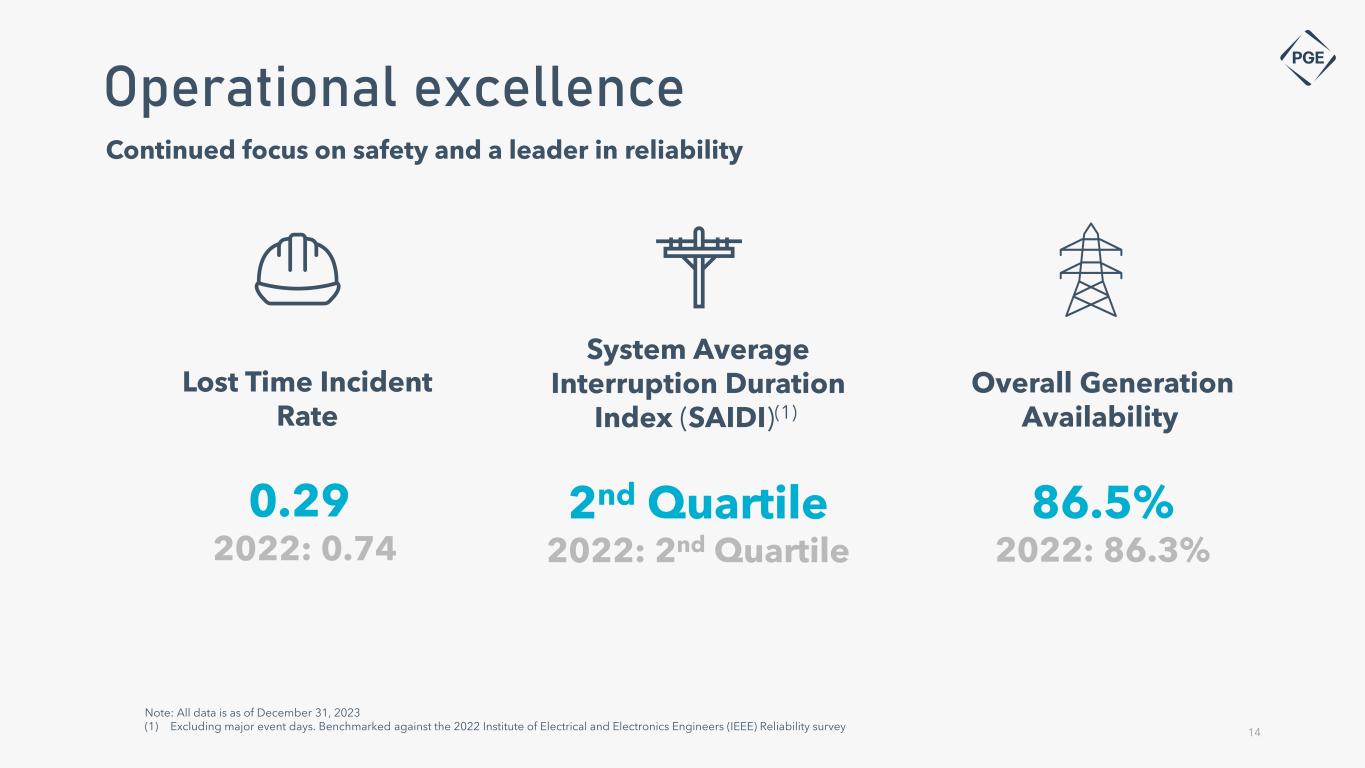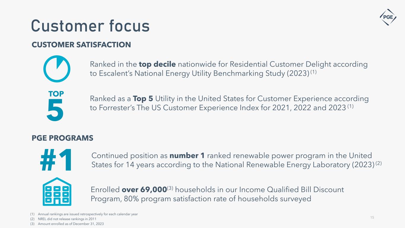 0.29 2022: 0.74 14 Operational excellence Note: All data is as of December 31, 2023 (1) Excluding major event days. Benchmarked against the 2022 Institute of Electrical and Electronics Engineers (IEEE) Reliability survey System Average Interruption Duration Index (SAIDI)(1) 2nd Quartile 2022: 2nd Quartile Continued focus on safety and a leader in reliability Overall Generation Availability 86.5% 2022: 86.3% Lost Time Incident Rate
