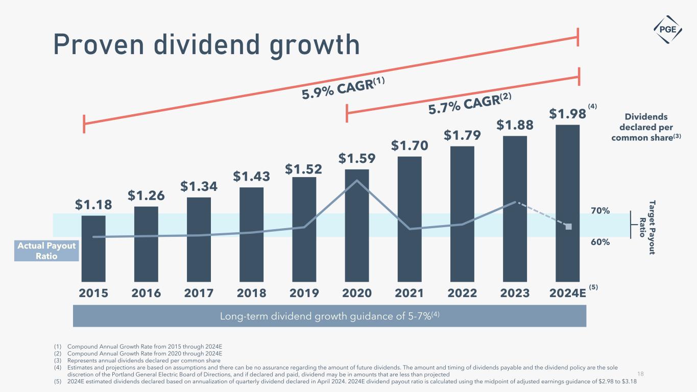 1.72 2.72 2.60 2.33 2020 2021 2022 2023 2024E $2.75(1) (4) $1.72(1) $2.33(3) $2.72 17 Accounting ROE(6) 6.0% 9.2% 8.5% 7.5% 8.6% - 9.2%(5)(6)(7) Allowed ROE 9.5% 9.5% 9.5% 9.5% 9.5% GAAP EPS (diluted) Long-term 5% to 7%(4) earnings growth from 2022 adjusted base year Long-term financial performance Adjusted Non-GAAP Guidance(7) (diluted) $3.18(4)(7) $2.98(4)(7) $2.60(2) $2.38(3) $2.74(2) $2.60(2) (1) In 2020 GAAP net income was $155 million, or $1.72 per diluted share. After adjusting for the impacts of the Energy Trading Losses, non-GAAP net income was $247 million, or $2.75 per diluted share. The net effect of the energy trading losses was $1.03 per diluted share (see appendix for important information about non-GAAP measures, guidance, and reconciliations) (2) In 2022, GAAP net income was $233 million, or $2.60 per diluted share. After adjusting for the impacts of released deferrals related to 2020, non-GAAP net income was $245 million, or $2.74 per diluted share. The net effect of the deferral release was $0.14 per diluted share (see appendix for important information about non-GAAP measures, guidance, and reconciliations) (3) In 2023, GAAP net income was $228 million, or $2.33 per diluted share. After adjusting for the impacts of Boardman revenue requirement settlement charge, non-GAAP net income was $233 million, or $2.38 per diluted share. The net effect of the deferral release was $0.05 per diluted share (see appendix for important information about non-GAAP measures, guidance, and reconciliations) (4) Estimates and projections are based on assumptions and there can be no assurance regarding the amount of future earnings consistent with earnings guidance and earnings growth guidance (5) 2024E Accounting ROE calculated based on adjusted earnings guidance range of $2.98 to $3.18 (see appendix for important information about non-GAAP measures, guidance, and reconciliations) (6) Return on average equity (7) See appendix for important information about non-GAAP measures, guidance, and reconciliations Non-GAAP EPS (diluted)