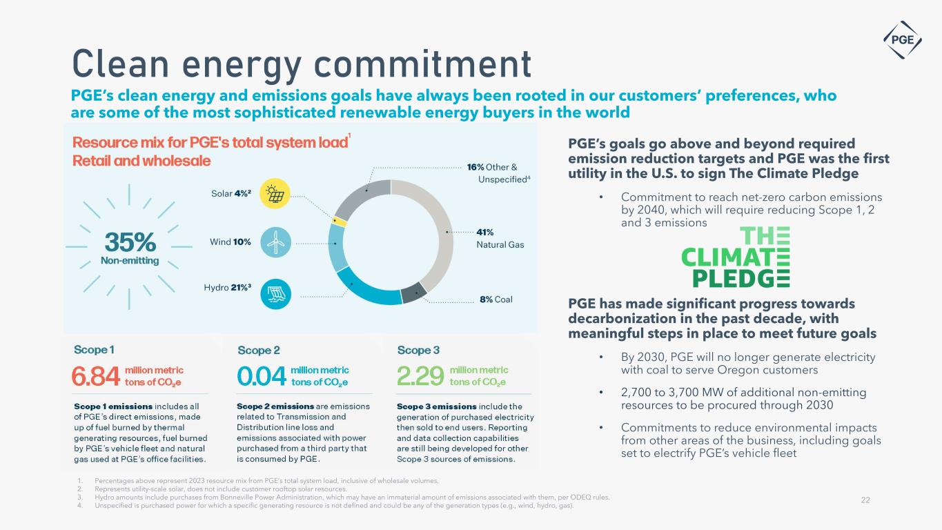 Environmental, social, & governance highlights GHG Emissions Targets In 2023, PGE’s total system load was comprised of 35% specified, non-emitting energy sources. PGE continued to make steady progress, reducing emissions from unspecified sources(1), procuring clean energy resources and investing in the tools that will support driving emissions toward target levels in future years Clean Energy Investment Completed construction of the new Clearwater 311 MW wind energy facility in January 2024 and procured 475 MW of battery energy storage systems to begin serving customers in 2024 and 2025 Green Financing Framework Executed an additional $500 million in green bonds in 2023 to continue supporting clean energy investments under our Green Financing Framework Diversity, Equity and Inclusion Amidst tight labor market conditions, PGE continued to attract and retain a diverse workforce, with women accounting for over 35% and Black, Indigenous and People of Color (BIPOC) employees more than a fourth, of the leadership at PGE Our 2023 Environmental, Social & Governance Report highlights key initiatives and achievements that support PGE’s commitment to decarbonization and advancing well-being for customers, employees, communities and the environment Decarbonize Electrify Perform 21 1) Unspecified sources consist of purchased power for which a specific generating resource is not defined, and could be any of the generation types (e.g., wind, hydro, gas)