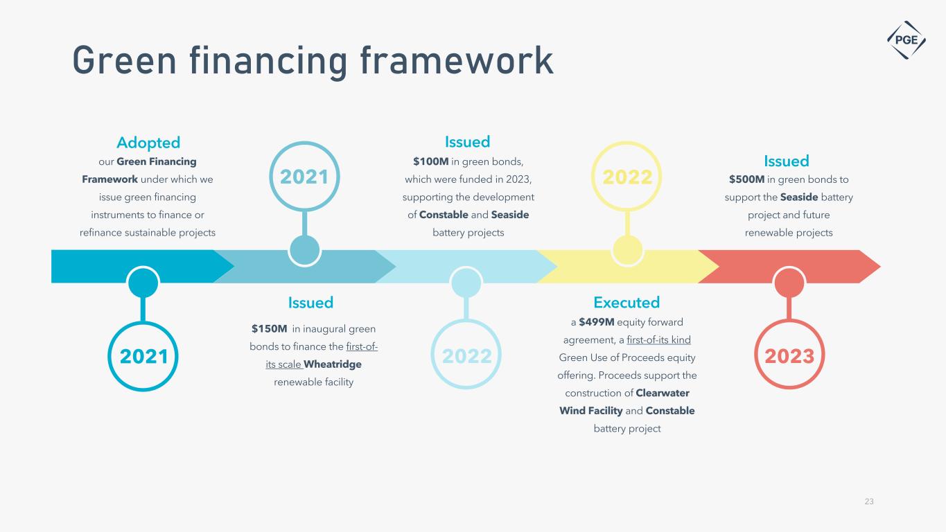 PGE’s goals go above and beyond required emission reduction targets and PGE was the first utility in the U.S. to sign The Climate Pledge • Commitment to reach net-zero carbon emissions by 2040, which will require reducing Scope 1, 2 and 3 emissions PGE’s clean energy and emissions goals have always been rooted in our customers’ preferences, who are some of the most sophisticated renewable energy buyers in the world Clean energy commitment PGE has made significant progress towards decarbonization in the past decade, with meaningful steps in place to meet future goals • By 2030, PGE will no longer generate electricity with coal to serve Oregon customers • 2,700 to 3,700 MW of additional non-emitting resources to be procured through 2030 • Commitments to reduce environmental impacts from other areas of the business, including goals set to electrify PGE’s vehicle fleet 1. Percentages above represent 2023 resource mix from PGE’s total system load, inclusive of wholesale volumes. 2. Represents utility-scale solar, does not include customer rooftop solar resources. 3. Hydro amounts include purchases from Bonneville Power Administration, which may have an immaterial amount of emissions associated with them, per ODEQ rules. 4. Unspecified is purchased power for which a specific generating resource is not defined and could be any of the generation types (e.g., wind, hydro, gas). 22