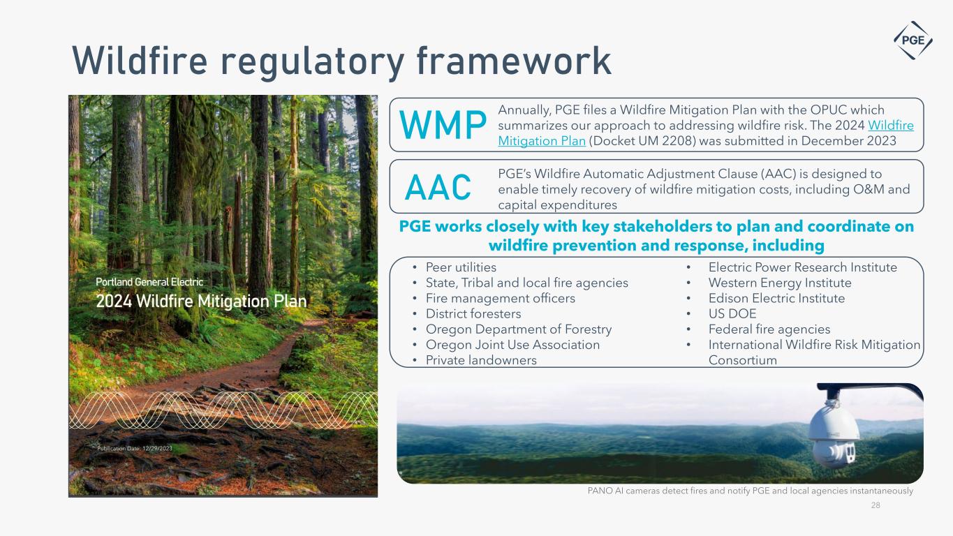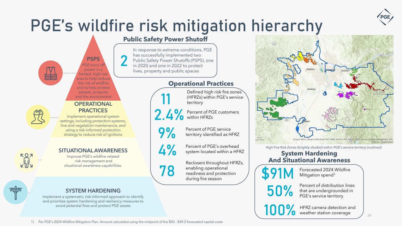 WMP Annually, PGE files a Wildfire Mitigation Plan with the OPUC which summarizes our approach to addressing wildfire risk. The 2024 Wildfire Mitigation Plan (Docket UM 2208) was submitted in December 2023 PGE’s Wildfire Automatic Adjustment Clause (AAC) is designed to enable timely recovery of wildfire mitigation costs, including O&M and capital expenditures AAC PGE works closely with key stakeholders to plan and coordinate on wildfire prevention and response, including Wildfire regulatory framework • Electric Power Research Institute • Western Energy Institute • Edison Electric Institute • US DOE • Federal fire agencies • International Wildfire Risk Mitigation Consortium • Peer utilities • State, Tribal and local fire agencies • Fire management officers • District foresters • Oregon Department of Forestry • Oregon Joint Use Association • Private landowners 28 PANO AI cameras detect fires and notify PGE and local agencies instantaneously