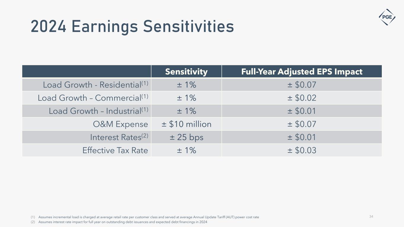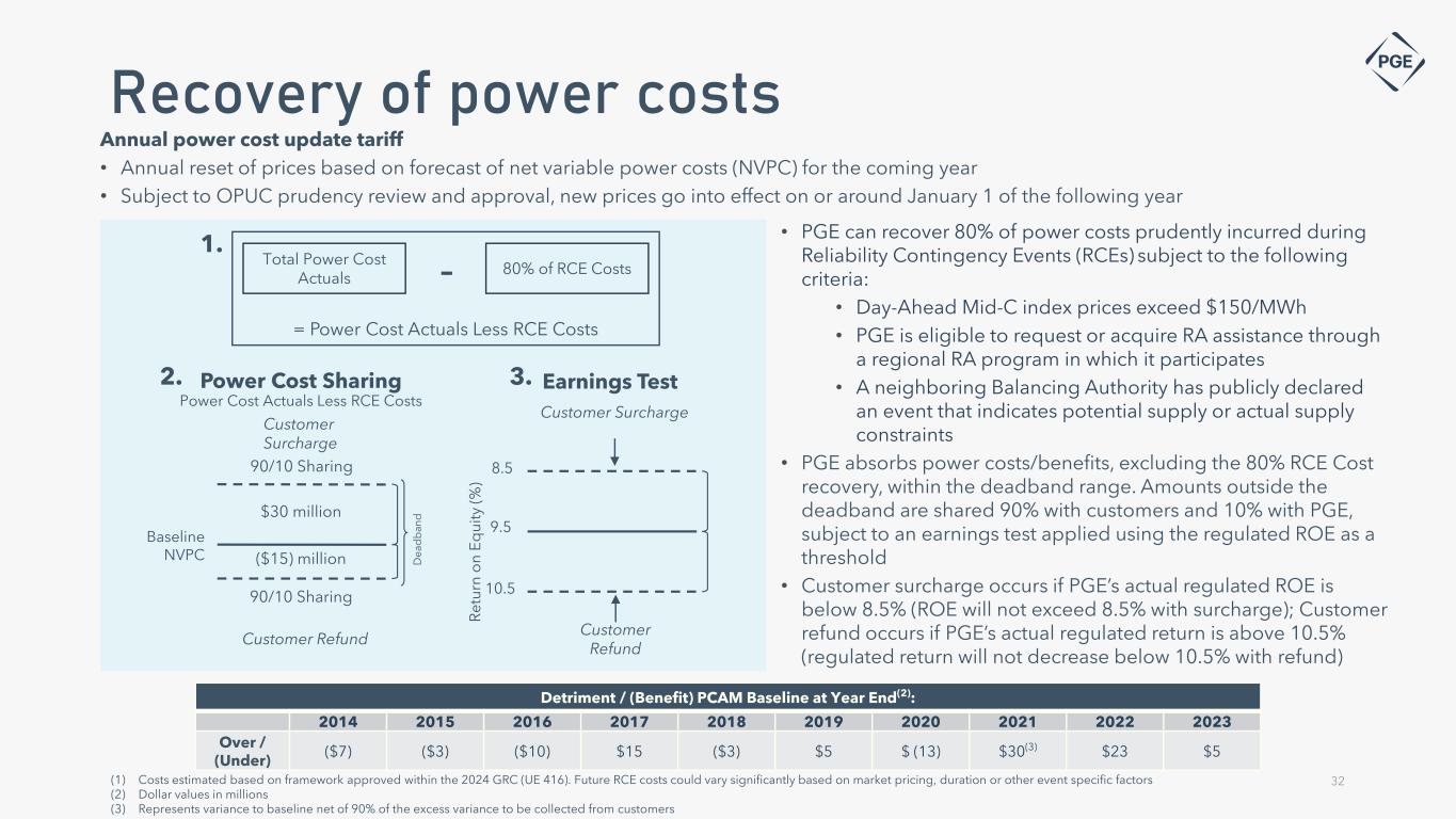 Annual power cost update tariff • Annual reset of prices based on forecast of net variable power costs (NVPC) for the coming year • Subject to OPUC prudency review and approval, new prices go into effect on or around January 1 of the following year • PGE can recover 80% of power costs prudently incurred during Reliability Contingency Events (RCEs) subject to the following criteria: • Day-Ahead Mid-C index prices exceed $150/MWh • PGE is eligible to request or acquire RA assistance through a regional RA program in which it participates • A neighboring Balancing Authority has publicly declared an event that indicates potential supply or actual supply constraints • PGE absorbs power costs/benefits, excluding the 80% RCE Cost recovery, within the deadband range. Amounts outside the deadband are shared 90% with customers and 10% with PGE, subject to an earnings test applied using the regulated ROE as a threshold • Customer surcharge occurs if PGE’s actual regulated ROE is below 8.5% (ROE will not exceed 8.5% with surcharge); Customer refund occurs if PGE’s actual regulated return is above 10.5% (regulated return will not decrease below 10.5% with refund) 9.5 10.5 8.5 R et ur n o n Eq ui ty (% ) ($15) million $30 million Customer Refund 90/10 Sharing Baseline NVPC 90/10 Sharing Customer Refund Customer Surcharge Customer Surcharge D ea d b an d Power Cost Sharing Power Cost Actuals Less RCE Costs Earnings Test 32 Detriment / (Benefit) PCAM Baseline at Year End(2): 2014 2015 2016 2017 2018 2019 2020 2021 2022 2023 Over / (Under) ($7) ($3) ($10) $15 ($3) $5 $ (13) $30(3) $23 $5 Recovery of power costs (1) Costs estimated based on framework approved within the 2024 GRC (UE 416). Future RCE costs could vary significantly based on market pricing, duration or other event specific factors (2) Dollar values in millions (3) Represents variance to baseline net of 90% of the excess variance to be collected from customers = Power Cost Actuals Less RCE Costs Total Power Cost Actuals 80% of RCE Costs 1. 2. 3.