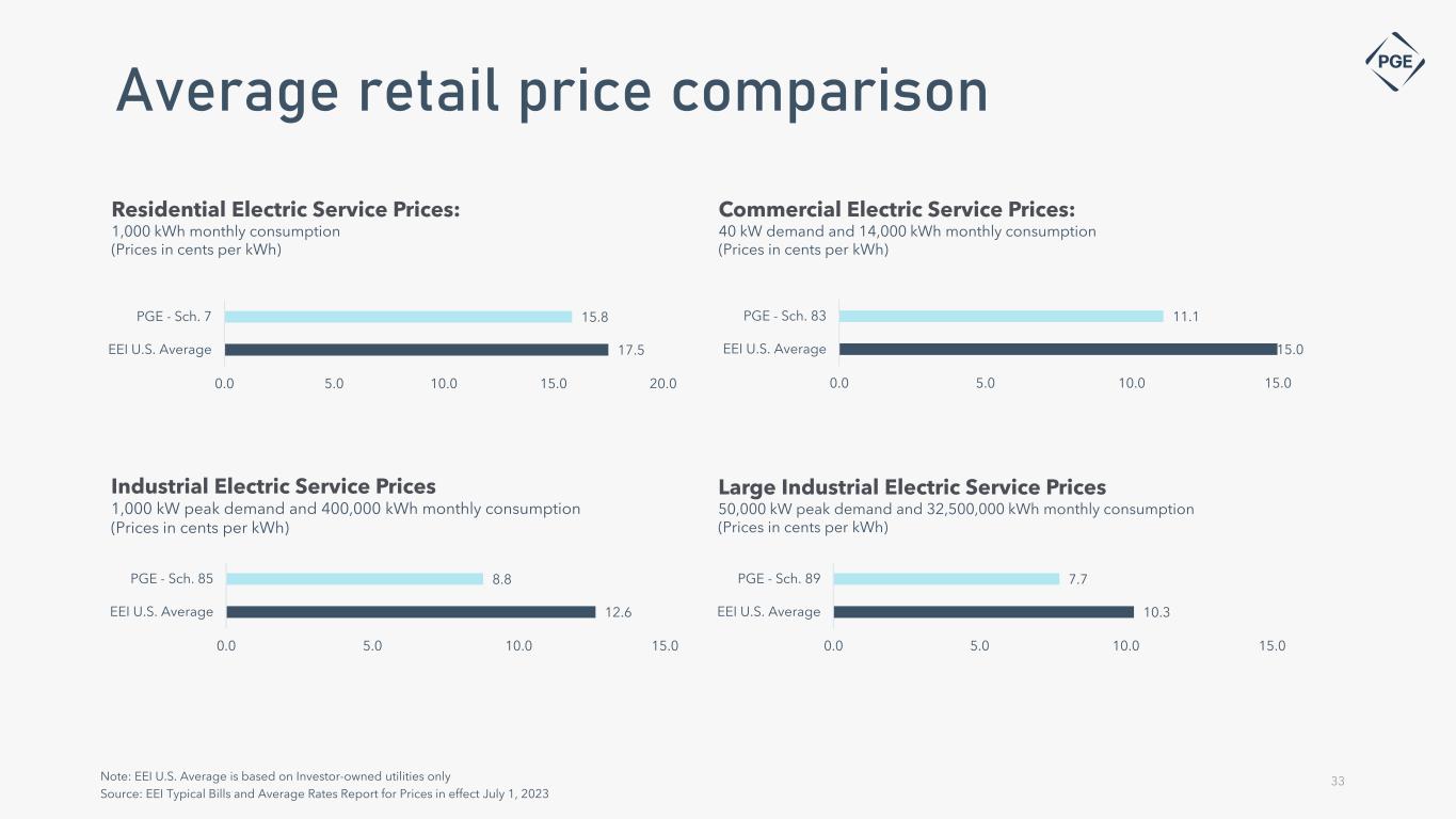 17.5 15.8 0.0 5.0 10.0 15.0 20.0 EEI U.S. Average PGE - Sch. 7 Residential Electric Service Prices: 1,000 kWh monthly consumption (Prices in cents per kWh) Commercial Electric Service Prices: 40 kW demand and 14,000 kWh monthly consumption (Prices in cents per kWh) Note: EEI U.S. Average is based on Investor-owned utilities only Source: EEI Typical Bills and Average Rates Report for Prices in effect July 1, 2023 33 Industrial Electric Service Prices 1,000 kW peak demand and 400,000 kWh monthly consumption (Prices in cents per kWh) Large Industrial Electric Service Prices 50,000 kW peak demand and 32,500,000 kWh monthly consumption (Prices in cents per kWh) Average retail price comparison 15.0 11.1 0.0 5.0 10.0 15.0 EEI U.S. Average PGE - Sch. 83 12.6 8.8 0.0 5.0 10.0 15.0 EEI U.S. Average PGE - Sch. 85 10.3 7.7 0.0 5.0 10.0 15.0 EEI U.S. Average PGE - Sch. 89