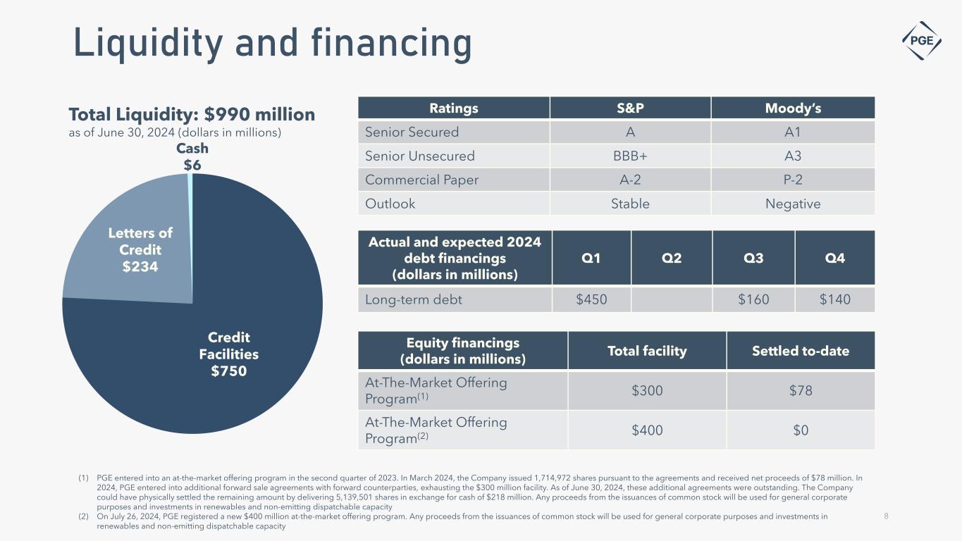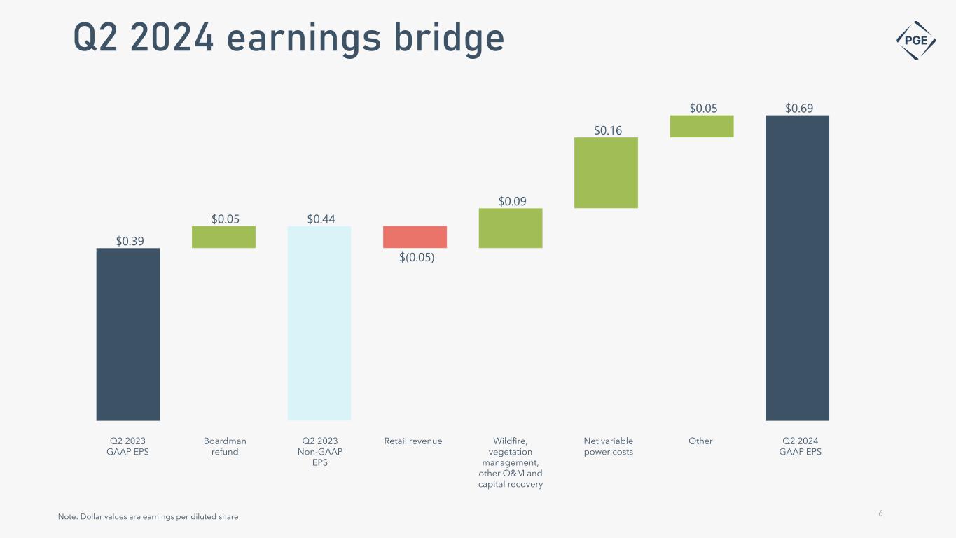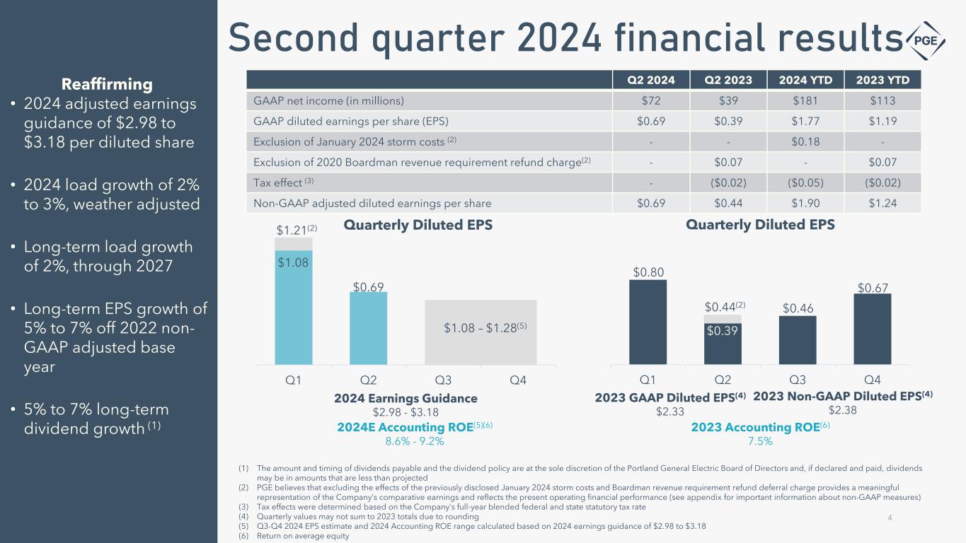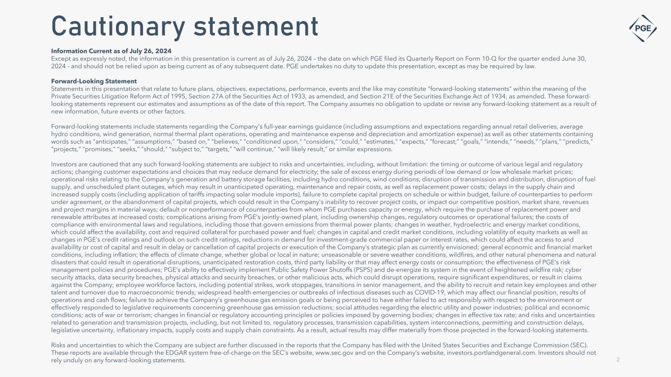 Cautionary statement Information Current as of July 26, 2024 Except as expressly noted, the information in this presentation is current as of July 26, 2024 – the date on which PGE filed its Quarterly Report on Form 10-Q for the quarter ended June 30, 2024 - and should not be relied upon as being current as of any subsequent date. PGE undertakes no duty to update this presentation, except as may be required by law. Forward-Looking Statement Statements in this presentation that relate to future plans, objectives, expectations, performance, events and the like may constitute "forward-looking statements" within the meaning of the Private Securities Litigation Reform Act of 1995, Section 27A of the Securities Act of 1933, as amended, and Section 21E of the Securities Exchange Act of 1934, as amended. These forward- looking statements represent our estimates and assumptions as of the date of this report. The Company assumes no obligation to update or revise any forward-looking statement as a result of new information, future events or other factors. Forward-looking statements include statements regarding the Company's full-year earnings guidance (including assumptions and expectations regarding annual retail deliveries, average hydro conditions, wind generation, normal thermal plant operations, operating and maintenance expense and depreciation and amortization expense) as well as other statements containing words such as "anticipates," “assumptions,” “based on,” "believes," "conditioned upon," “considers,” “could,” "estimates," "expects," “forecast,” “goals,” “intends,” “needs,” “plans,” “predicts,” “projects,” “promises,“ “seeks,” "should," “subject to,” “targets,” “will continue,” “will likely result,” or similar expressions. Investors are cautioned that any such forward-looking statements are subject to risks and uncertainties, including, without limitation: the timing or outcome of various legal and regulatory actions; changing customer expectations and choices that may reduce demand for electricity; the sale of excess energy during periods of low demand or low wholesale market prices; operational risks relating to the Company's generation and battery storage facilities, including hydro conditions, wind conditions, disruption of transmission and distribution, disruption of fuel supply, and unscheduled plant outages, which may result in unanticipated operating, maintenance and repair costs, as well as replacement power costs; delays in the supply chain and increased supply costs (including application of tariffs impacting solar module imports), failure to complete capital projects on schedule or within budget, failure of counterparties to perform under agreement, or the abandonment of capital projects, which could result in the Company's inability to recover project costs, or impact our competitive position, market share, revenues and project margins in material ways; default or nonperformance of counterparties from whom PGE purchases capacity or energy, which require the purchase of replacement power and renewable attributes at increased costs; complications arising from PGE’s jointly-owned plant, including ownership changes, regulatory outcomes or operational failures; the costs of compliance with environmental laws and regulations, including those that govern emissions from thermal power plants; changes in weather, hydroelectric and energy market conditions, which could affect the availability, cost and required collateral for purchased power and fuel; changes in capital and credit market conditions, including volatility of equity markets as well as changes in PGE’s credit ratings and outlook on such credit ratings, reductions in demand for investment-grade commercial paper or interest rates, which could affect the access to and availability or cost of capital and result in delay or cancellation of capital projects or execution of the Company’s strategic plan as currently envisioned; general economic and financial market conditions, including inflation; the effects of climate change, whether global or local in nature; unseasonable or severe weather conditions, wildfires, and other natural phenomena and natural disasters that could result in operational disruptions, unanticipated restoration costs, third party liability or that may affect energy costs or consumption; the effectiveness of PGE’s risk management policies and procedures; PGE’s ability to effectively implement Public Safety Power Shutoffs (PSPS) and de-energize its system in the event of heightened wildfire risk; cyber security attacks, data security breaches, physical attacks and security breaches, or other malicious acts, which could disrupt operations, require significant expenditures, or result in claims against the Company; employee workforce factors, including potential strikes, work stoppages, transitions in senior management, and the ability to recruit and retain key employees and other talent and turnover due to macroeconomic trends; widespread health emergencies or outbreaks of infectious diseases such as COVID-19, which may affect our financial position, results of operations and cash flows; failure to achieve the Company’s greenhouse gas emission goals or being perceived to have either failed to act responsibly with respect to the environment or effectively responded to legislative requirements concerning greenhouse gas emission reductions; social attitudes regarding the electric utility and power industries; political and economic conditions; acts of war or terrorism; changes in financial or regulatory accounting principles or policies imposed by governing bodies; changes in effective tax rate; and risks and uncertainties related to generation and transmission projects, including, but not limited to, regulatory processes, transmission capabilities, system interconnections, permitting and construction delays, legislative uncertainty,