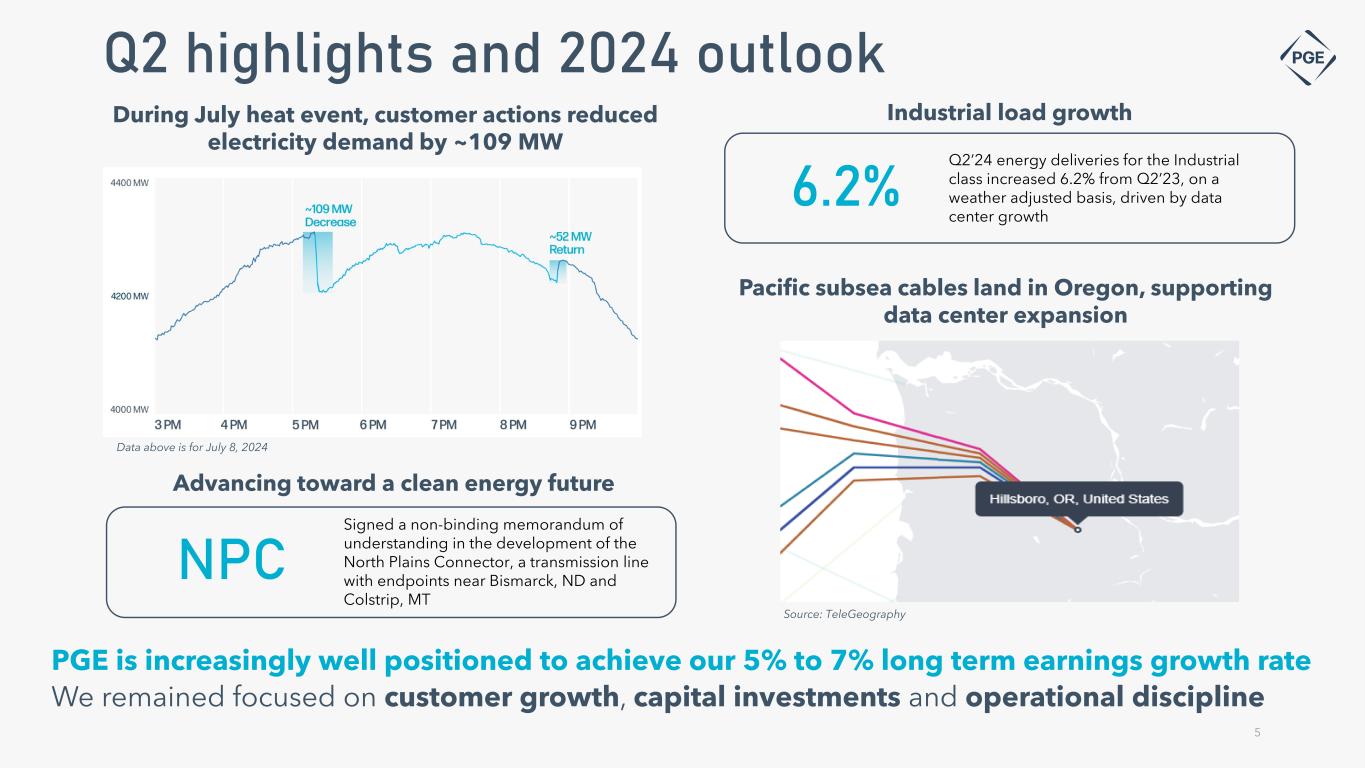 $0.80 $0.39 $0.46 Q1 Q2 Q3 Q4 Quarterly Diluted EPS $0.44(2) $0.67 Q2 2024 Q2 2023 2024 YTD 2023 YTD GAAP net income (in millions) $72 $39 $181 $113 GAAP diluted earnings per share (EPS) $0.69 $0.39 $1.77 $1.19 Exclusion of January 2024 storm costs (2) - - $0.18 - Exclusion of 2020 Boardman revenue requirement refund charge(2) - $0.07 - $0.07 Tax effect (3) - ($0.02) ($0.05) ($0.02) Non-GAAP adjusted diluted earnings per share $0.69 $0.44 $1.90 $1.24 (1) The amount and timing of dividends payable and the dividend policy are at the sole discretion of the Portland General Electric Board of Directors and, if declared and paid, dividends may be in amounts that are less than projected (2) PGE believes that excluding the effects of the previously disclosed January 2024 storm costs and Boardman revenue requirement refund deferral charge provides a meaningful representation of the Company’s comparative earnings and reflects the present operating financial performance (see appendix for important information about non-GAAP measures) (3) Tax effects were determined based on the Company’s full-year blended federal and state statutory tax rate (4) Quarterly values may not sum to 2023 totals due to rounding (5) Q3-Q4 2024 EPS estimate and 2024 Accounting ROE range calculated based on 2024 earnings guidance of $2.98 to $3.18 (6) Return on average equity Second quarter 2024 financial results 4 Reaffirming • 2024 adjusted earnings guidance of $2.98 to $3.18 per diluted share • 2024 load growth of 2% to 3%, weather adjusted • Long-term load growth of 2%, through 2027 • Long-term EPS growth of 5% to 7% off 2022 non- GAAP adjusted base year • 5% to 7% long-term dividend growth (1) 2023 GAAP Diluted EPS(4) $2.33 $1.08 Q1 Q2 Q3 Q4 Quarterly Diluted EPS$1.21(2) $1.08 – $1.28(5) $0.69 2024 Earnings Guidance $2.98 - $3.18 2023 Non-GAAP Diluted EPS(4) $2.38 2024E Accounting ROE(5)(6) 8.6% - 9.2% 2023 Accounting ROE(6) 7.5%