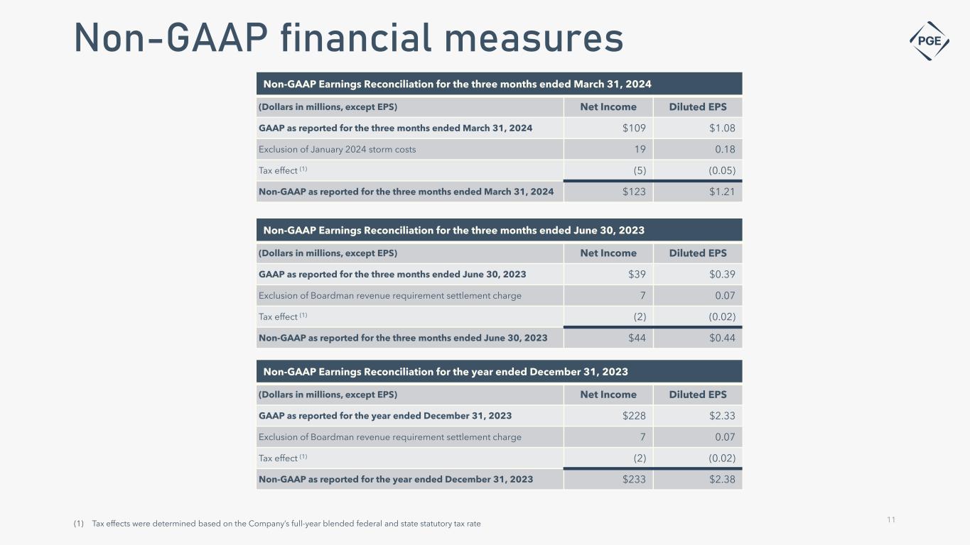 This presentation contains certain non-GAAP measures, such as adjusted earnings, adjusted EPS and adjusted earnings guidance. These non-GAAP financial measures exclude significant items that are generally not related to our ongoing business activities, are infrequent in nature, or both. PGE believes that excluding the effects of these items provides a meaningful representation of the Company’s comparative earnings per share and enables investors to evaluate the Company’s ongoing operating financial performance. Management utilizes non-GAAP measures to assess the Company’s current and forecasted performance, and for communications with shareholders, analysts and investors. Non-GAAP financial measures are supplementary information that should be considered in addition to, but not as a substitute for, the information prepared in accordance with GAAP. Items in the periods presented, which PGE believes impact the comparability of comparative earnings and do not represent ongoing operating financial performance, include the following: • 2024: Non-deferrable Reliability Contingency Event (RCE) costs resulting from the January 2024 winter storm • 2023: Boardman revenue requirement settlement charge associated with the year ended 2020, resulting from the OPUC’s 2022 GRC Final Order Due to the forward-looking nature of PGE’s non-GAAP adjusted earnings guidance, and the inherently unpredictable nature of items and events which could lead to the recognition of non-GAAP adjustments (such as, but not limited to, regulatory disallowances or extreme weather events), management is unable to estimate the occurrence or value of specific items requiring adjustment for future periods, which could potentially impact the Company’s GAAP earnings. Therefore, management cannot provide a reconciliation of non-GAAP adjusted earnings per share guidance to the most comparable GAAP financial measure without unreasonable effort. For the same reasons, management is unable to address the probable significance of unavailable information. PGE’s reconciliation of non-GAAP earnings for the three months ended March 31, 2024, the three months ended June 30, 2023 , and the year ended December 31, 2023 are on the following slide. 10 Non-GAAP financial measures
