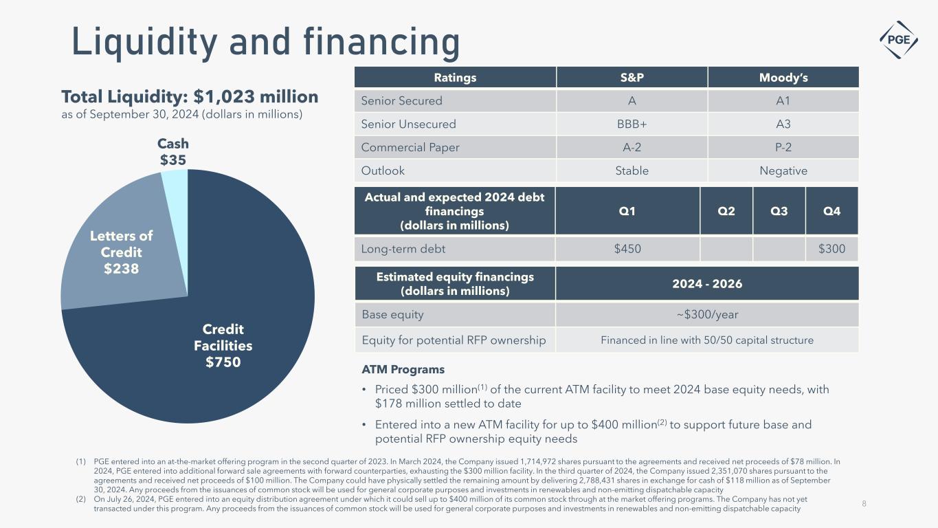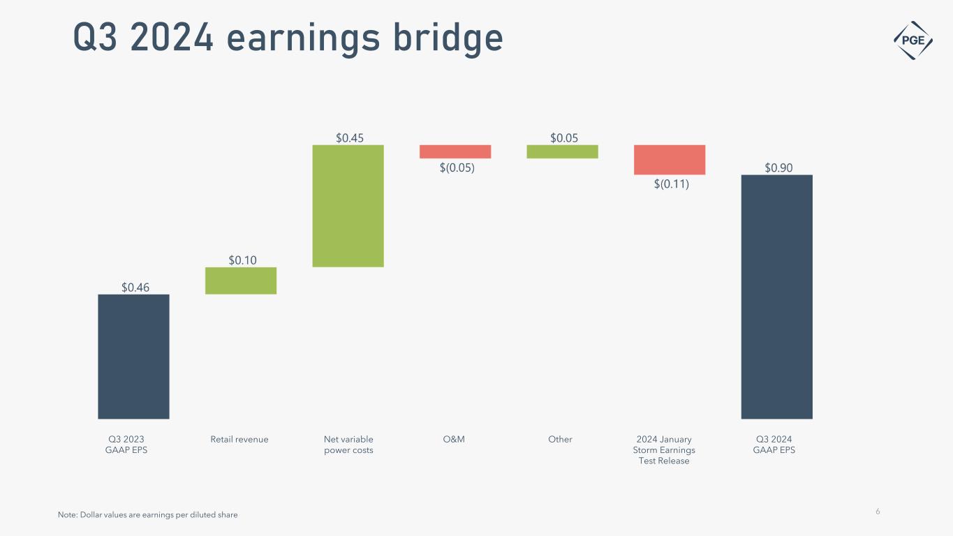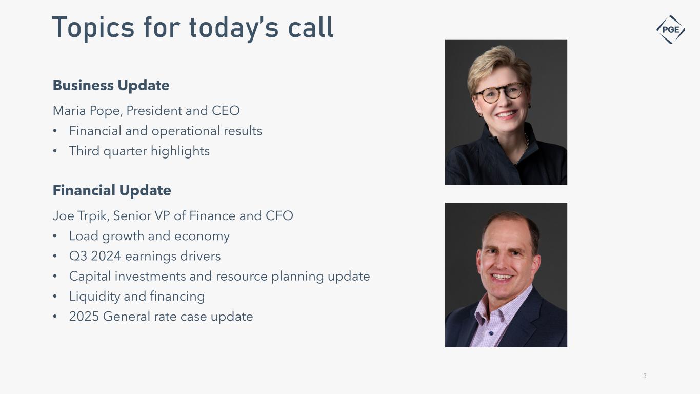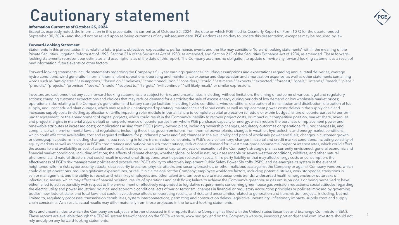 Cautionary statement Information Current as of October 25, 2024 Except as expressly noted, the information in this presentation is current as of October 25, 2024 – the date on which PGE filed its Quarterly Report on Form 10-Q for the quarter ended September 30, 2024 - and should not be relied upon as being current as of any subsequent date. PGE undertakes no duty to update this presentation, except as may be required by law. Forward-Looking Statement Statements in this presentation that relate to future plans, objectives, expectations, performance, events and the like may constitute "forward-looking statements" within the meaning of the Private Securities Litigation Reform Act of 1995, Section 27A of the Securities Act of 1933, as amended, and Section 21E of the Securities Exchange Act of 1934, as amended. These forward- looking statements represent our estimates and assumptions as of the date of this report. The Company assumes no obligation to update or revise any forward-looking statement as a result of new information, future events or other factors. Forward-looking statements include statements regarding the Company's full-year earnings guidance (including assumptions and expectations regarding annual retail deliveries, average hydro conditions, wind generation, normal thermal plant operations, operating and maintenance expense and depreciation and amortization expense) as well as other statements containing words such as "anticipates," "assumptions," "based on," "believes," "conditioned upon," "considers," "could," "estimates," "expects," “expected,” "forecast," "goals," "intends," "needs," "plans," "predicts," "projects," "promises," "seeks," "should," "subject to," "targets," "will continue," "will likely result," or similar expressions. Investors are cautioned that any such forward-looking statements are subject to risks and uncertainties, including, without limitation: the timing or outcome of various legal and regulatory actions; changing customer expectations and choices that may reduce demand for electricity; the sale of excess energy during periods of low demand or low wholesale market prices; operational risks relating to the Company's generation and battery storage facilities, including hydro conditions, wind conditions, disruption of transmission and distribution, disruption of fuel supply, and unscheduled plant outages, which may result in unanticipated operating, maintenance and repair costs, as well as replacement power costs; delays in the supply chain and increased supply costs (including application of tariffs impacting solar module imports), failure to complete capital projects on schedule or within budget, failure of counterparties to perform under agreement, or the abandonment of capital projects, which could result in the Company's inability to recover project costs, or impact our competitive position, market share, revenues and project margins in material ways; default or nonperformance of counterparties from whom PGE purchases capacity or energy, which require the purchase of replacement power and renewable attributes at increased costs; complications arising from PGE’s jointly-owned plant, including ownership changes, regulatory outcomes or operational failures; changes in, and compliance with, environmental laws and regulations, including those that govern emissions from thermal power plants; changes in weather, hydroelectric and energy market conditions, which could affect the availability, cost and required collateral for purchased power and fuel; changes in the availability and price of wholesale power and fuels; changes in customer growth, or demographic patterns, including changes in load resulting in future transmission constraints, in PGE’s service territory; changes in capital and credit market conditions, including volatility of equity markets as well as changes in PGE’s credit ratings and outlook on such credit ratings, reductions in demand for investment-grade commercial paper or interest rates, which could affect the access to and availability or cost of capital and result in delay or cancellation of capital projects or execution of the Company’s strategic plan as currently envisioned; general economic and financial market conditions, including inflation; the effects of climate change, whether global or local in nature; unseasonable or severe weather conditions, wildfires, and other natural phenomena and natural disasters that could result in operational disruptions, unanticipated restoration costs, third party liability or that may affect energy costs or consumption; the effectiveness of PGE’s risk management policies and procedures; PGE’s ability to effectively implement Public Safety Power Shutoffs (PSPS) and de-energize its system in the event of heightened wildfire risk; cybersecurity attacks, data security breaches, physical attacks and security breaches, or other malicious acts against the Company or against Company vendors, which could disrupt operations, require significant expenditures, or result in claims against the Company; employee workforce factors, including potential strikes, work stoppages, transitions in senior management, and the ability to recruit and retain key employees and other talent and turnover due to macroeconomic trends; widespread health emergencies or outbreaks of infectious diseases, which may affect our financial position, results of operations and cash flows; failure to achieve the Company’s greenhouse gas emission goals or being perceived to have either failed to act responsibly with respect to the environment or effectively responded to legislative requirements concerning greenhouse gas emission reductions; social attitudes regarding the electric utility and power industries; political and economic conditions; acts of war or terrorism; changes in financial or regulatory accounting principles or policies imposed by governing bodies; new federal, state, and local laws that could have adverse