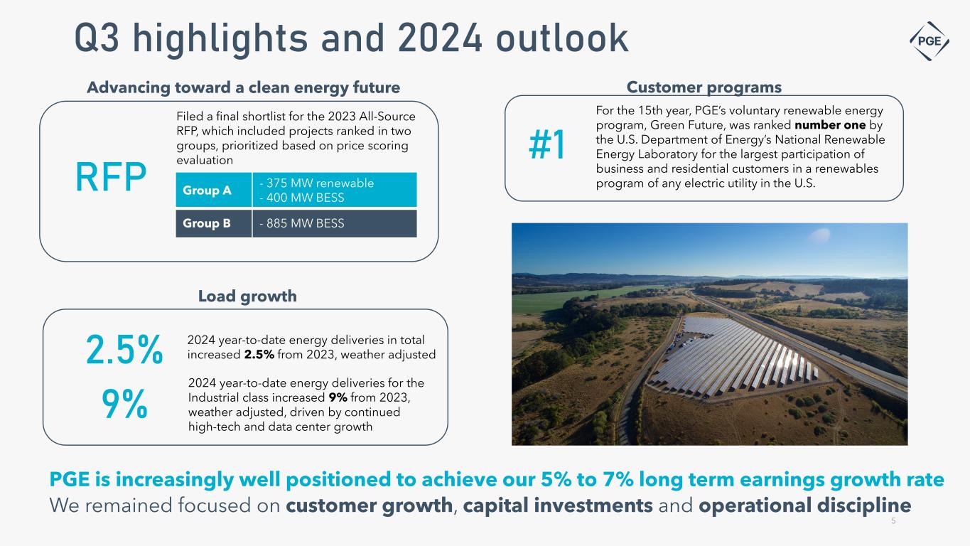 $0.80 $0.39 $0.46 Q1 Q2 Q3 Q4 Quarterly Diluted EPS $0.44(2) $0.67 Q3 2024 Q3 2023 2024 YTD 2023 YTD GAAP net income (in millions) $94 $47 $275 $160 GAAP diluted earnings per share (EPS) $0.90 $0.46 $2.67 $1.65 Exclusion of January 2024 storm costs (2) - - $0.18 - Exclusion of 2020 Boardman revenue requirement refund charge(2) - - - $0.07 Tax effect (3) - - ($0.05) ($0.02) Non-GAAP adjusted diluted earnings per share $0.90 $0.46 $2.80 $1.70 (1) The amount and timing of dividends payable and the dividend policy are at the sole discretion of the Portland General Electric Board of Directors and, if declared and paid, dividends may be in amounts that are less than projected (2) PGE believes that excluding the effects of the previously disclosed January 2024 storm costs and Boardman revenue requirement refund deferral charge provides a meaningful representation of the Company’s comparative earnings and reflects the present operating financial performance (see appendix for important information about non-GAAP measures) (3) Tax effects were determined based on the Company’s full-year blended federal and state statutory tax rate (4) Quarterly values may not sum to 2023 totals due to rounding (5) Q4 2024 EPS estimate and 2024 Accounting ROE range calculated based on 2024 earnings guidance of $3.08 to $3.18 (6) Return on average equity Third quarter 2024 financial results 4 Updating • 2024 adjusted earnings guidance from $2.98 to $3.18 to $3.08 to $3.18 per diluted share Reaffirming • 2024 load growth of 2% to 3%, weather adjusted • Long-term load growth of 2%, through 2027 • Long-term EPS growth of 5% to 7% off 2022 non- GAAP adjusted base year • 5% to 7% long-term dividend growth (1) 2023 GAAP Diluted EPS(4) $2.33 $1.08 Q1 Q2 Q3 Q4 Quarterly Diluted EPS$1.21(2) $0.28 – $0.38(5) $0.69 $0.90 2024 Earnings Guidance $3.08 - $3.18 2023 Non-GAAP Diluted EPS(4) $2.38 2024E Accounting ROE(5)(6) 9.1% - 9.4% 2023 Accounting ROE(6) 7.5%