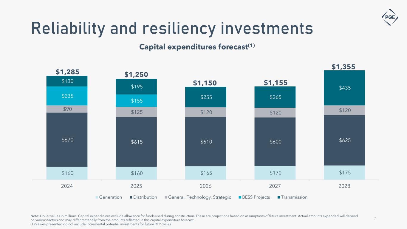 Note: Dollar values in millions. Capital expenditures exclude allowance for funds used during construction. These are projections based on assumptions of future investment. Actual amounts expended will depend on various factors and may differ materially from the amounts reflected in this capital expenditure forecast (1) Values presented do not include incremental potential investments for future RFP cycles Reliability and resiliency investments Capital expenditures forecast(1) $160 $160 $165 $170 $175 $670 $615 $610 $600 $625 $90 $125 $120 $120 $120 $235 $155 $130 $195 $255 $265 $435 2024 2025 2026 2027 2028 Generation Distribution General, Technology, Strategic BESS Projects Transmission $1,155$1,150 $1,355 $1,285 $1,250 7