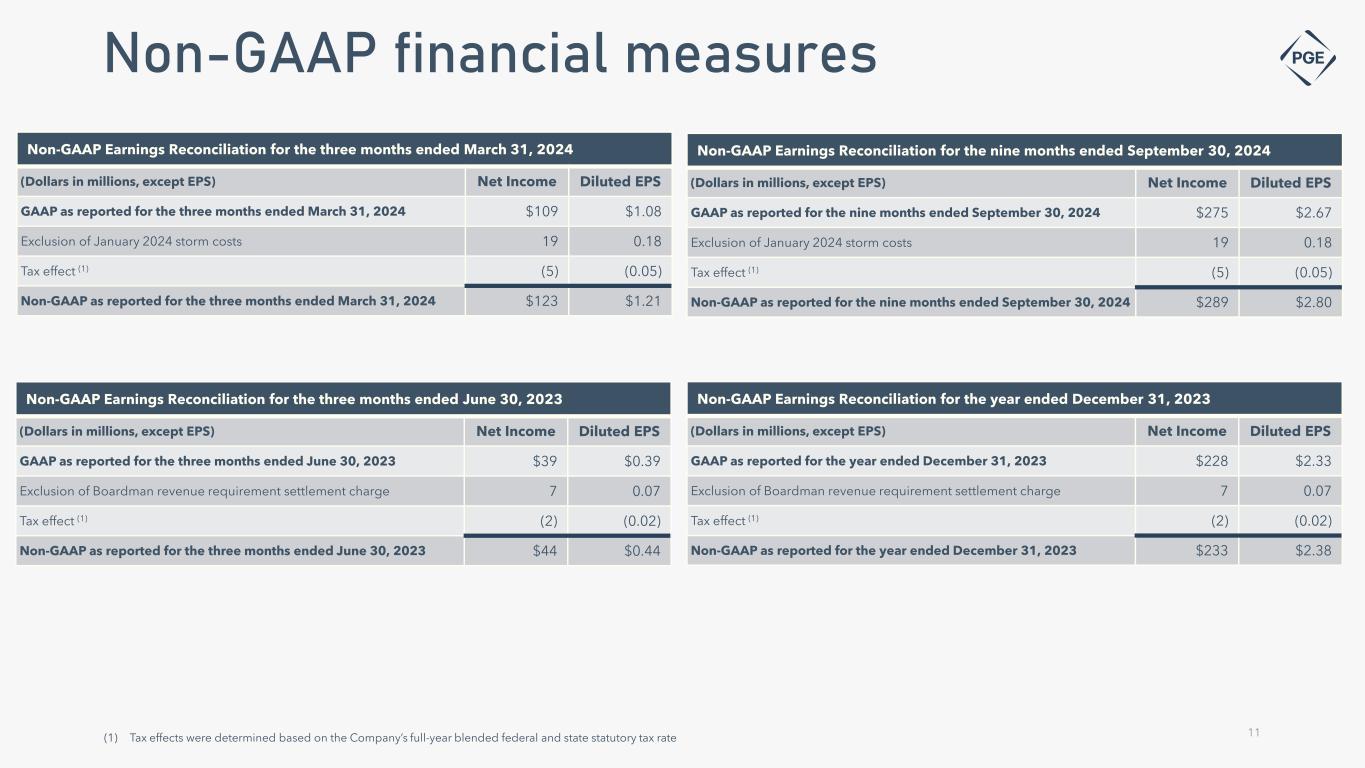 This presentation contains certain non-GAAP measures, such as adjusted earnings, adjusted EPS and adjusted earnings guidance. These non-GAAP financial measures exclude significant items that are generally not related to our ongoing business activities, are infrequent in nature, or both. PGE believes that excluding the effects of these items provides a meaningful representation of the Company’s comparative earnings per share and enables investors to evaluate the Company’s ongoing operating financial performance. Management utilizes non-GAAP measures to assess the Company’s current and forecasted performance, and for communications with shareholders, analysts and investors. Non-GAAP financial measures are supplementary information that should be considered in addition to, but not as a substitute for, the information prepared in accordance with GAAP. Items in the periods presented, which PGE believes impact the comparability of comparative earnings and do not represent ongoing operating financial performance, include the following: • 2024: Non-deferrable Reliability Contingency Event (RCE) costs resulting from the January 2024 winter storm • 2023: Boardman revenue requirement settlement charge associated with the year ended 2020, resulting from the OPUC’s 2022 GRC Final Order Due to the forward-looking nature of PGE’s non-GAAP adjusted earnings guidance, and the inherently unpredictable nature of items and events which could lead to the recognition of non-GAAP adjustments (such as, but not limited to, regulatory disallowances or extreme weather events), management is unable to estimate the occurrence or value of specific items requiring adjustment for future periods, which could potentially impact the Company’s GAAP earnings. Therefore, management cannot provide a reconciliation of non-GAAP adjusted earnings per share guidance to the most comparable GAAP financial measure without unreasonable effort. For the same reasons, management is unable to address the probable significance of unavailable information. PGE’s reconciliation of non-GAAP earnings for the three months ended March 31, 2024, the nine months ended September 30, 2024, the three months ended June 30, 2023 , and the year ended December 31, 2023 are on the following slide. 10 Non-GAAP financial measures