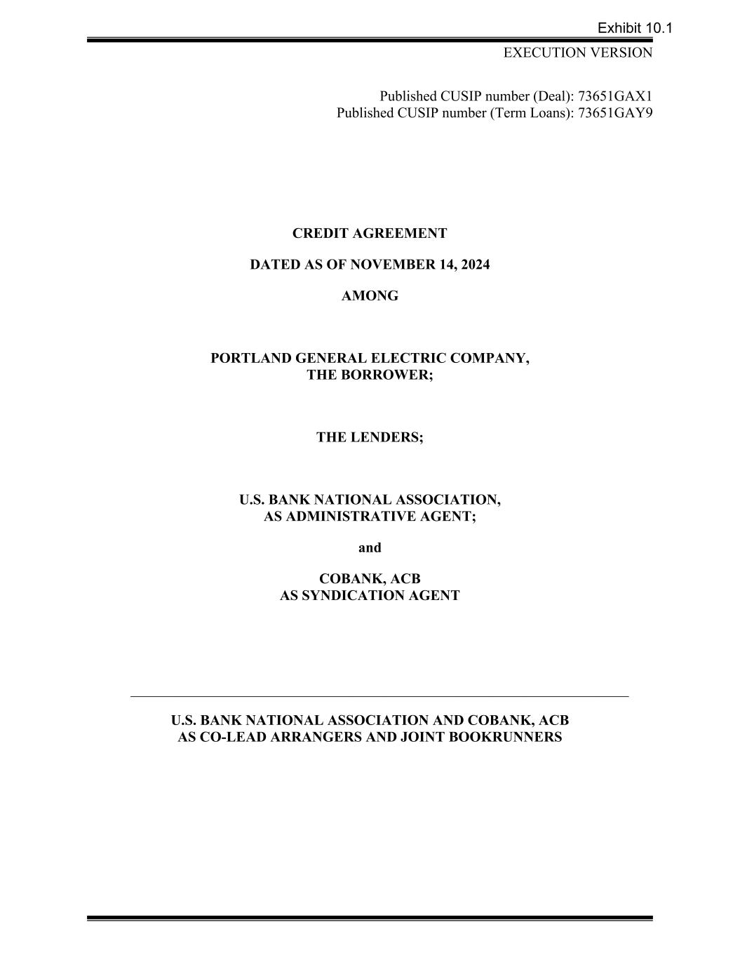 EXECUTION VERSION Published CUSIP number (Deal): 73651GAX1 Published CUSIP number (Term Loans): 73651GAY9 CREDIT AGREEMENT DATED AS OF NOVEMBER 14, 2024 AMONG PORTLAND GENERAL ELECTRIC COMPANY, THE BORROWER; THE LENDERS; U.S. BANK NATIONAL ASSOCIATION, AS ADMINISTRATIVE AGENT; and COBANK, ACB AS SYNDICATION AGENT _______________________________________________________________________________________________________ U.S. BANK NATIONAL ASSOCIATION AND COBANK, ACB AS CO-LEAD ARRANGERS AND JOINT BOOKRUNNERS Exhibit 10.1